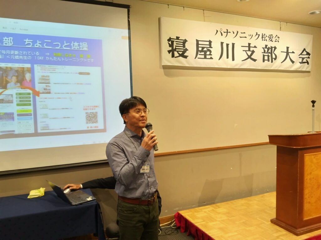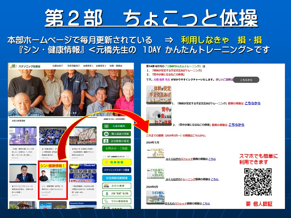 第2部 現在本部ホームページで紹介されているビデオ動画を利用した元橋先生の「1DAY かんたんトレーニング」の紹介とその中の一部を実践して身体をほぐし第3部の昼食懇親会に備えました。