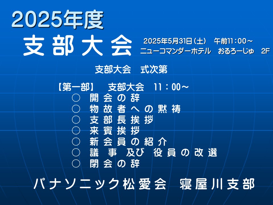 2025年度 支部大会 は5月31日(土)11:00より 地元 寝屋川市のニューコマンダーホテルにて会員94名の参加のもと実施されました。今回初めての地元での開催となります。