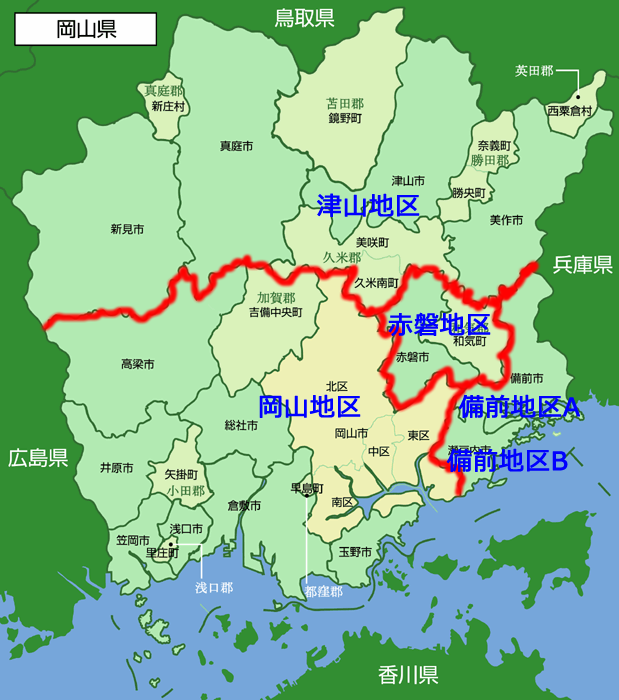 岡山市(東区瀬戸町を除く)、倉敷市、玉野市、笠岡市、井原市、高梁市、浅口市、矢掛町、里庄町、早島町、吉備中央町、