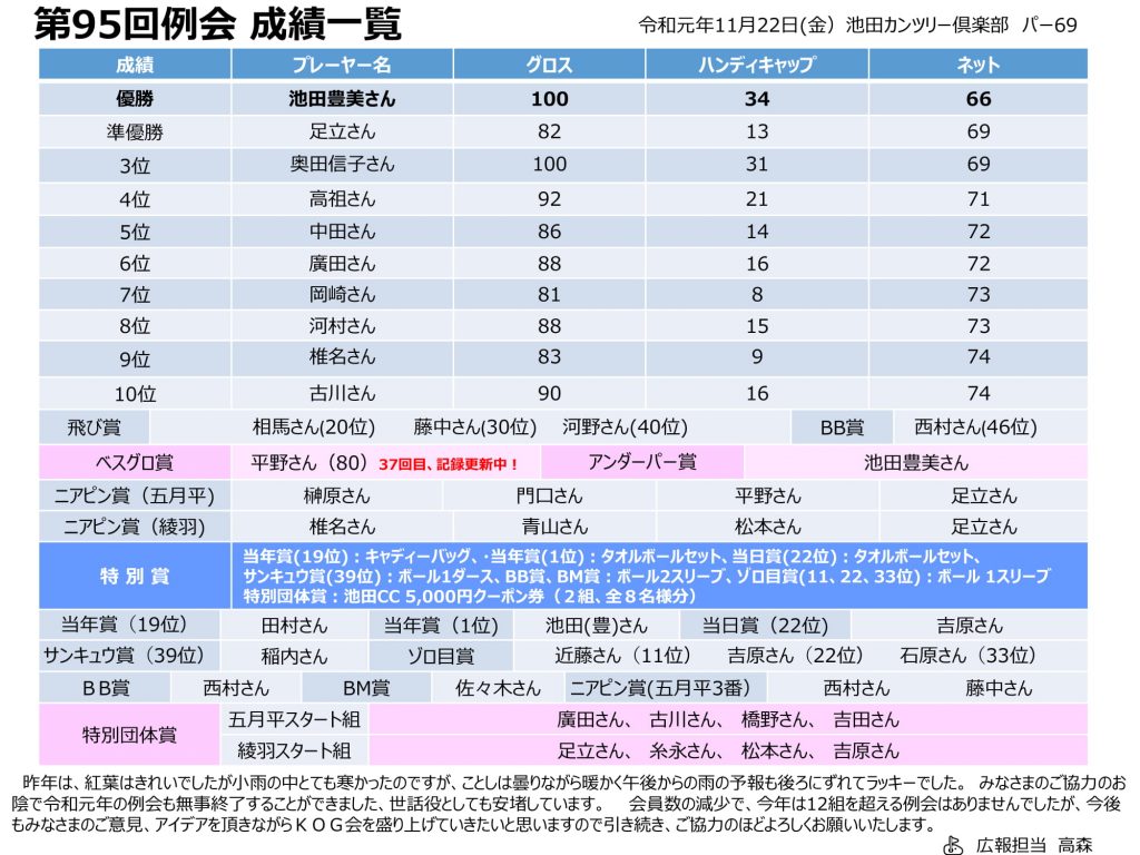今シーズン最後の例会は、恒例となった池田カンツリー倶楽部で47名の参加のもと、令和元年最後の戦いを繰りひろげました。午後からの雨予報も後ろにずれて、曇り模様でしたが寒くもなく暑くもなく、ゴルフには格好の気候でした。