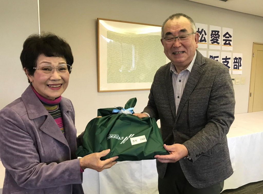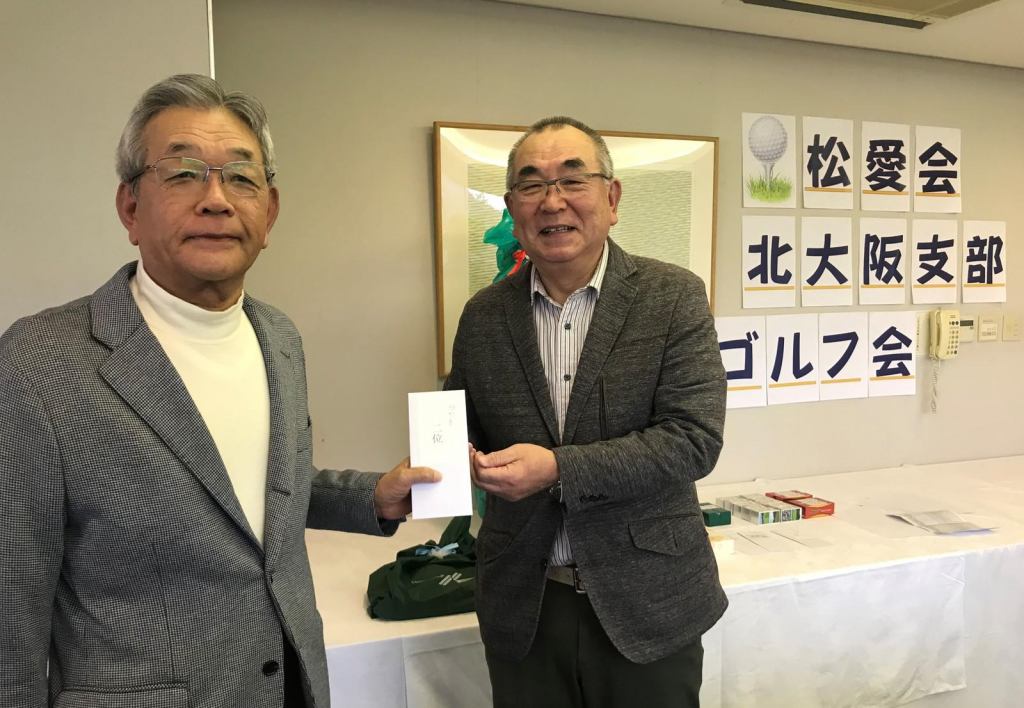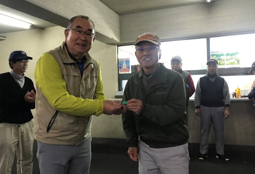 11月22日、いい夫婦の日に優勝出来ましたのは本当にラッキーでした。岡崎さん、山本さん、佐々木さんとメンバーにも恵まれ楽しいゴルフでした。18年間楽しみにして、参加させて頂いたそのご褒美だと思います。 第75回の時は丁度75歳で皆勤賞を頂きながら、その後、体の故障で3回程ゴルフが出来ず、2度とゴルフが出来ないのかと諦めていましたが、80歳までは好きなゴルフはやりたいとリハビリに努め頑張ってまいりました。その矢先に今回の優勝です。本当に嬉しかったです。ありがとうございました。(優勝者談)