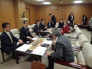 懇談では市長から800kgとはどのくらいの量になるのとかの質問に入江さんからドラム缶約9本分ですとの答えに驚かれていました。また、プルタブ収集に賛同してくれている方が勝手に入江さんの家に置いていってくれる話、「あすなろ」では2リットルのペットボトルに入れて収集してくれている話。上総さんからは大島耳鼻咽喉科の先生が協力していただいており、多くの患者さんからプルタブ収集の協力を得ている話などを紹介し、和やかな雰囲気の中、市長との懇談が行われました。