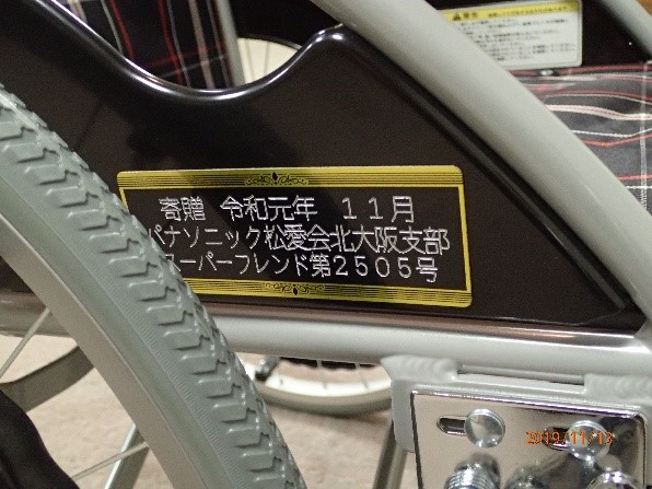 - 車椅子に取付けられた北大阪支部プレート