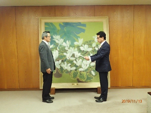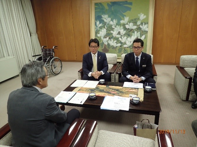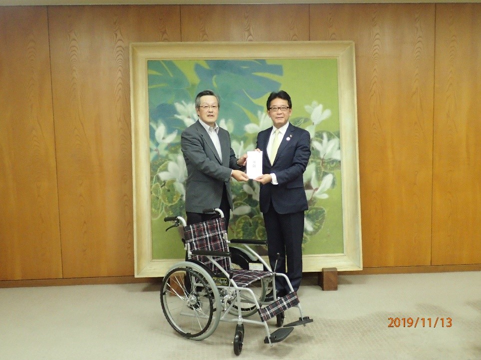 2019年11月13日(水)に車椅子を豊中市に贈呈いたしました。豊中市には3台目の贈呈となります。当日は雲一つない爽やかな秋晴れの中,市長応接室で行われました。