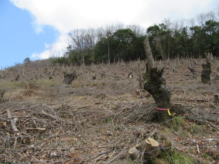 ◎◎クヌギの木を2m位を残し除伐していきます。これは、新芽を鹿害から守るためです。