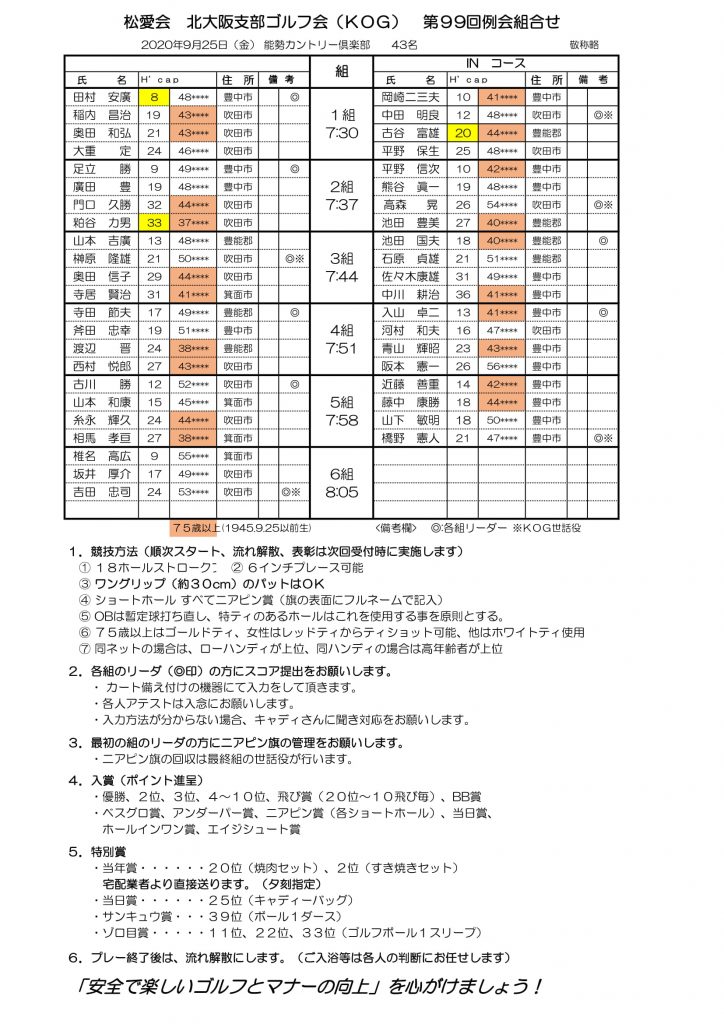 9月25日(金)開催の第99回例会(能勢CC)組合せを発表します。