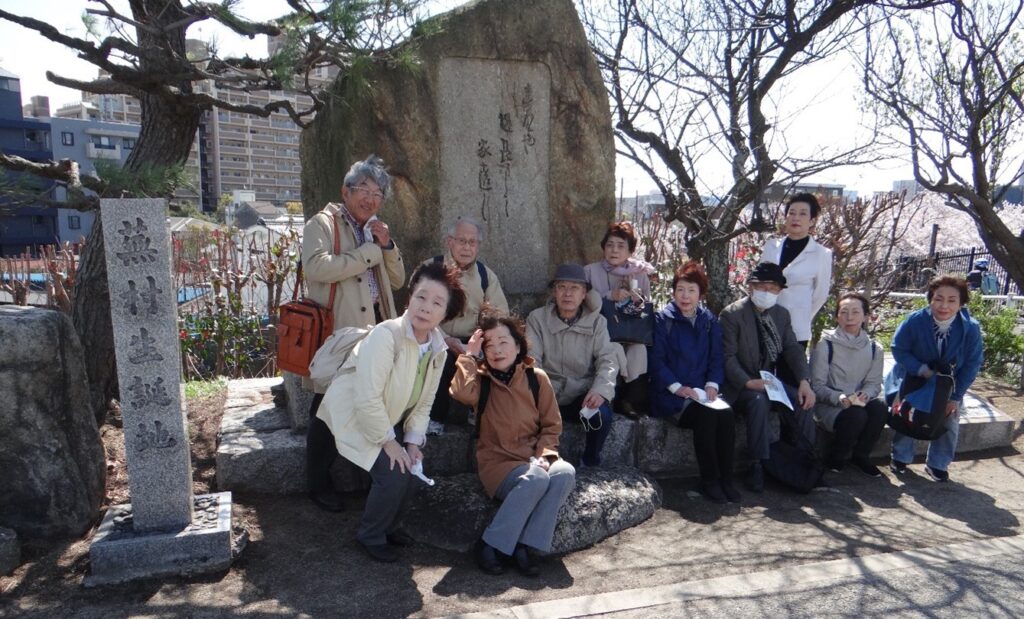 2022.04 俳句クラブ 春の吟行 北大阪支部 俳句クラブ 春の吟行 蕪村公園 令和4年4月1日 蕪村生誕地 石碑 「春風や堤長うして家遠し」 蕪村公園 蕪村「人物画」 淀川神社 蕪村銅像 毛馬の水門 菜の花と桜 句会後の懇親会(すし半にて) 蕪村公園:大阪市都島区毛馬町