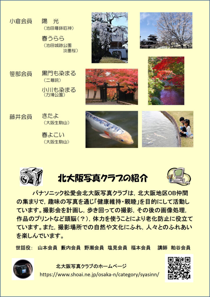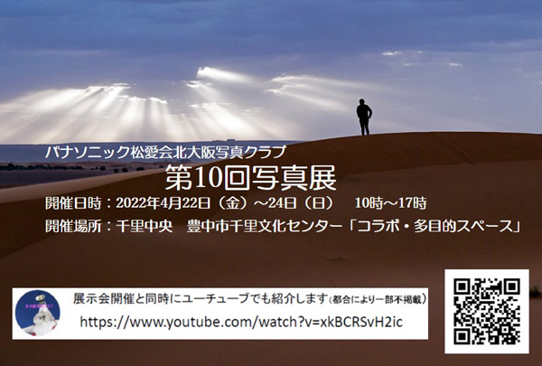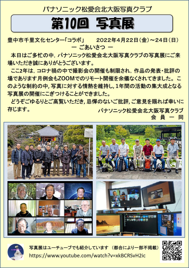 220407 写真クラブ写真展開催のお知らせ 写真クラブ 写真展開催 2022年4月22日~4月24日 ☆写真クラブ第10回写真展のご案内 ☆写真展会場はこちら↓ ☆パンフレットのご紹介 ☆ユーチューブに掲載中です こちら をクリックでユーチュブに繋がります URLは https://www.youtube.com/watch?v=xkBCRSvH2ic QRコードは、こちら↓