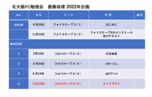 221118 オンラインパソコン勉強会 1.連絡事項 藪内講師 2.PhotoScapeX(その6) カットアウト方法を学ぶ 小山講師 3.Excelの使い方 データーベースを使っての住所録作成 岡本講師 4.Q&Aメンバーの広場 2023年の計画についての話し 藪内講師 2022年11月19日13時~14時 講師陣にて2023年計画打合せ実施:5名の講師陣体制(TOTAL24時間割当て)