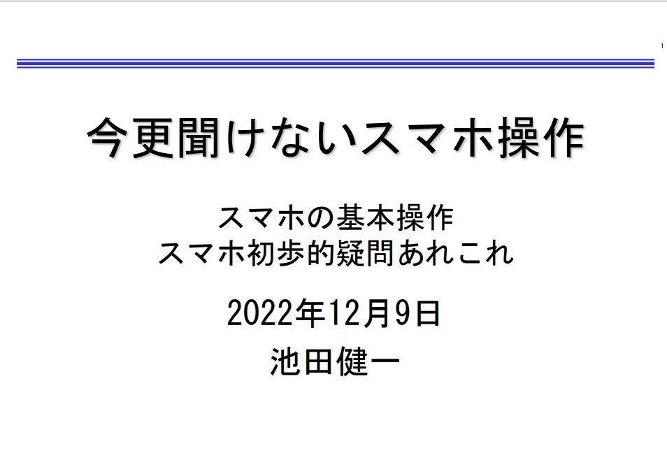 221209 オンラインパソコン勉強会 1.連絡事項:今年もこの講習で終わります。Q&Aにて来年(2023年)計画を説明します。 :薮内講師 2.今更聞けないスマホの操作:池田講師 3.通信について勉強しょう!:藪内講師(當山講師) 4.Q&Aみんなの広場:2023年計画について:藪内講師