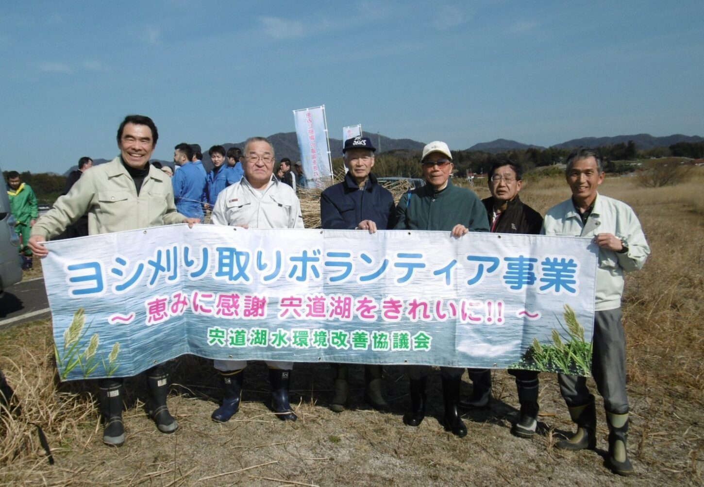 春風が心地よい好天の中、昨年同様、ヨシ刈り取りボランティアに参加しました。