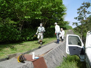 新型コロナ対策は、草刈りの前後にはマスクを、草刈り前後の手の消毒、フェースガードの消毒をしっかりと行い、最後の休憩の時間は短くしています。