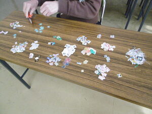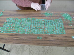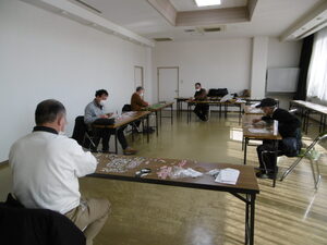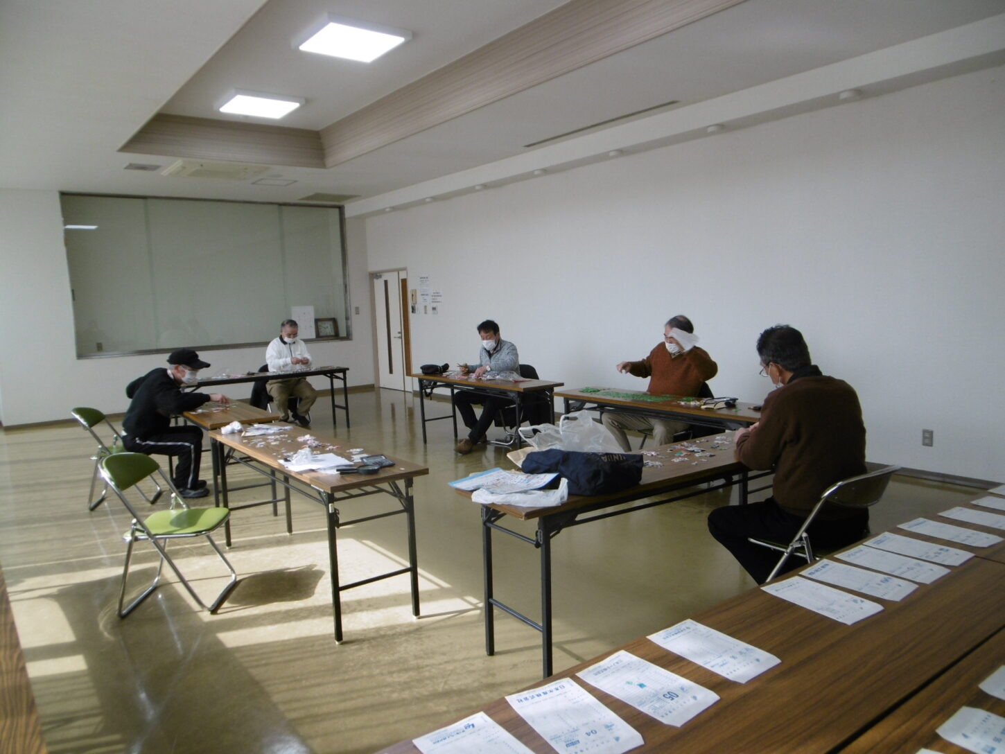 支部役員会の後、役員3人と米子地区の足立さん、岡田さん、住友さんに初参加をいただき、6人でベルマークの集計を行いました。16時の終了予定でしたが、ベルマークの返送枚数が多くて集計に時間が掛かり、1時間延長して17時前に大急ぎで片付けをして終了しました。そのために参加者の集合写真は、寒い夕方の観光センター入口での撮影となりました。コロナ対策は消毒はもちろんのこと、特にソーシャルディスタンスを重視し、机一つに一人、そして机の距離も会場いっぱいに離して行いました。