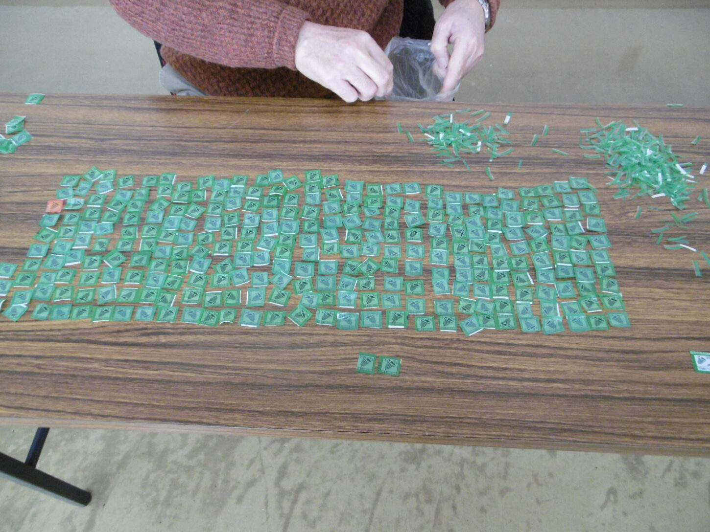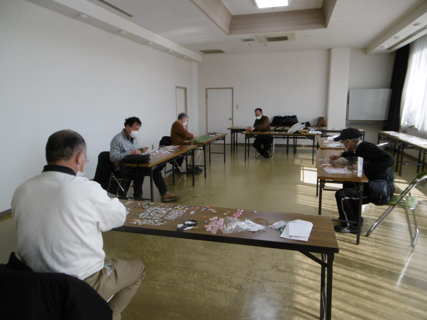 支部役員会の後、役員3人と米子地区の足立さん、岡田さん、住友さんに初参加をいただき、6人でベルマークの集計を行いました。16時の終了予定でしたが、ベルマークの返送枚数が多くて集計に時間が掛かり、1時間延長して17時前に大急ぎで片付けをして終了しました。そのために参加者の集合写真は、寒い夕方の観光センター入口での撮影となりました。コロナ対策は消毒はもちろんのこと、特にソーシャルディスタンスを重視し、机一つに一人、そして机の距離も会場いっぱいに離して行いました。