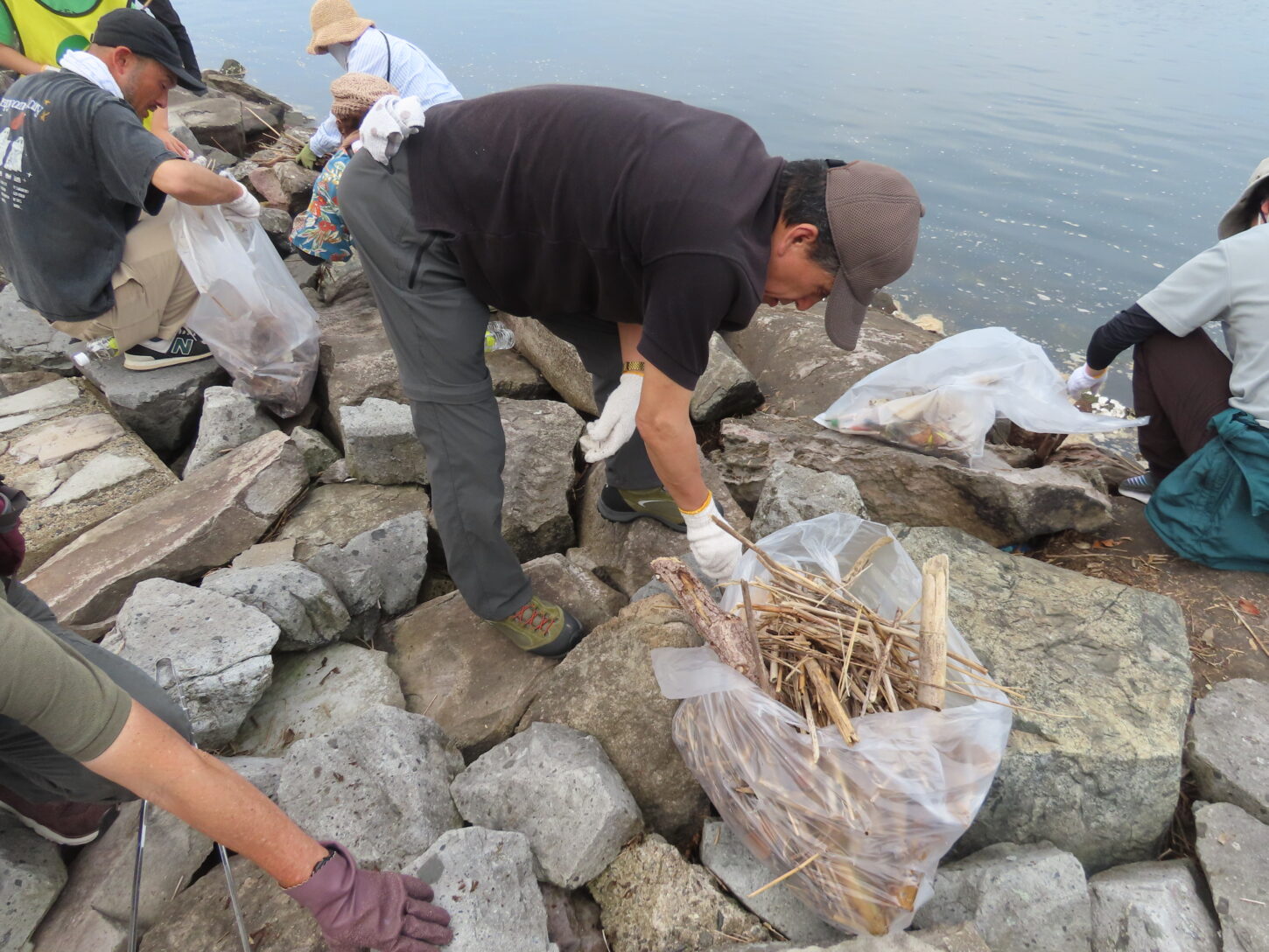 護岸には枯れた葦や古木が多く、ビニール袋一杯になりました。