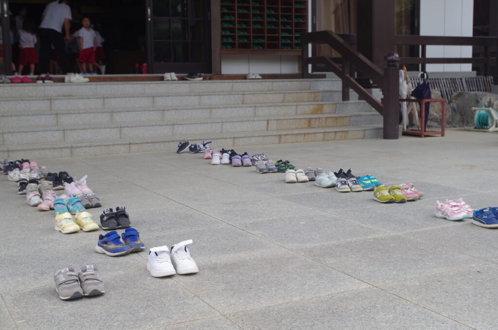 何と本堂の中で大勢の幼児たちが楽しそうに何かをしています。ふと階段下に目をやると、脱いだ靴が写真のように見事に揃えられているではありませんか。メンバー全員がこれを見て、豊かな気持ちになったと目を細めていました。