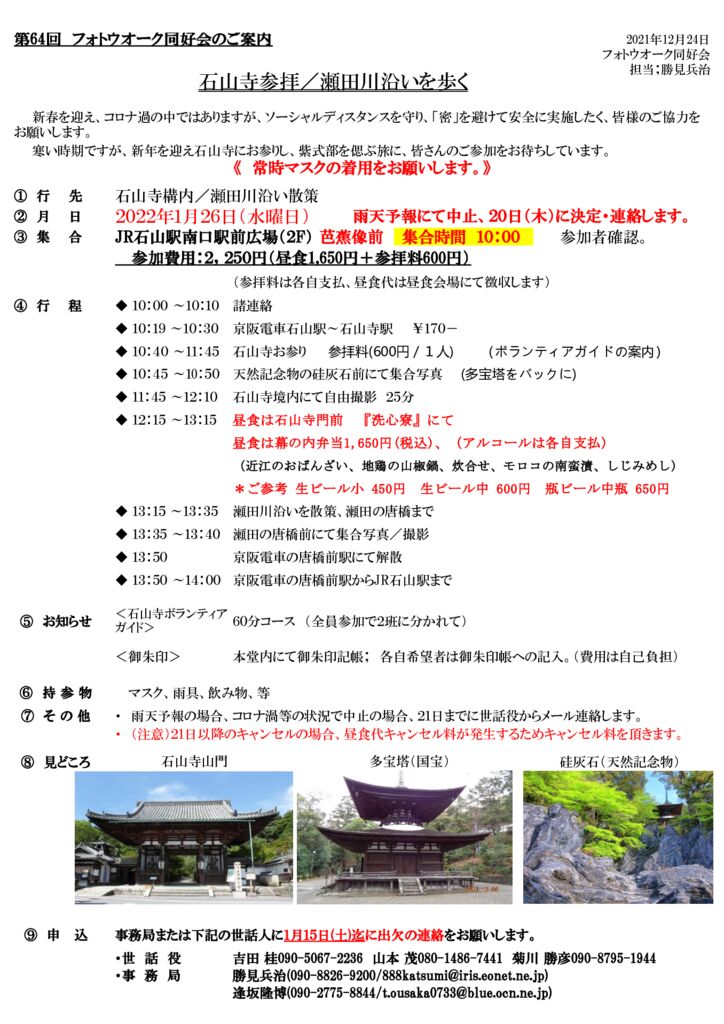 2021.12.24 一般公開前, 公開前 フォトウオーク同好会 第64回 開催案内 2022年度フォトウオーク例会計画(案)はこちら 投稿者: tomita 一般公開前, 公開前 コメント: 0 湖東・湖北グラウンドゴルフ愛好会 2021年12月 第…前の記事 2022年度フォトウオーク例会計画(案)次の記事