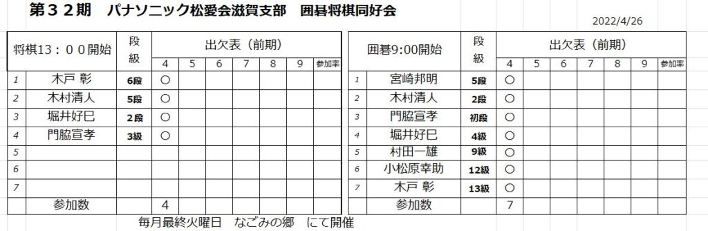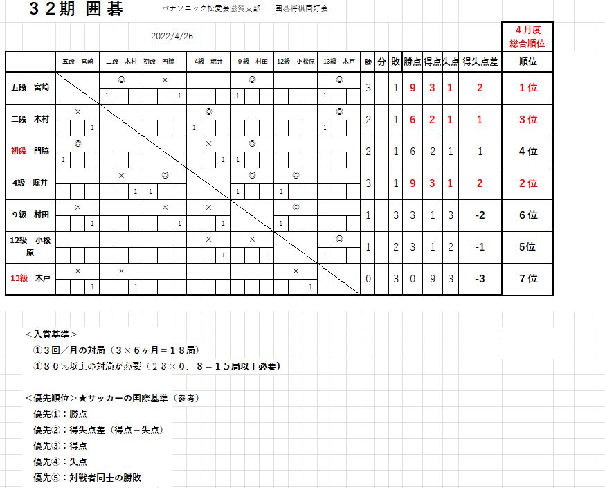 ◆囲碁の部 第32期 対戦勝敗表 (2022年4月)