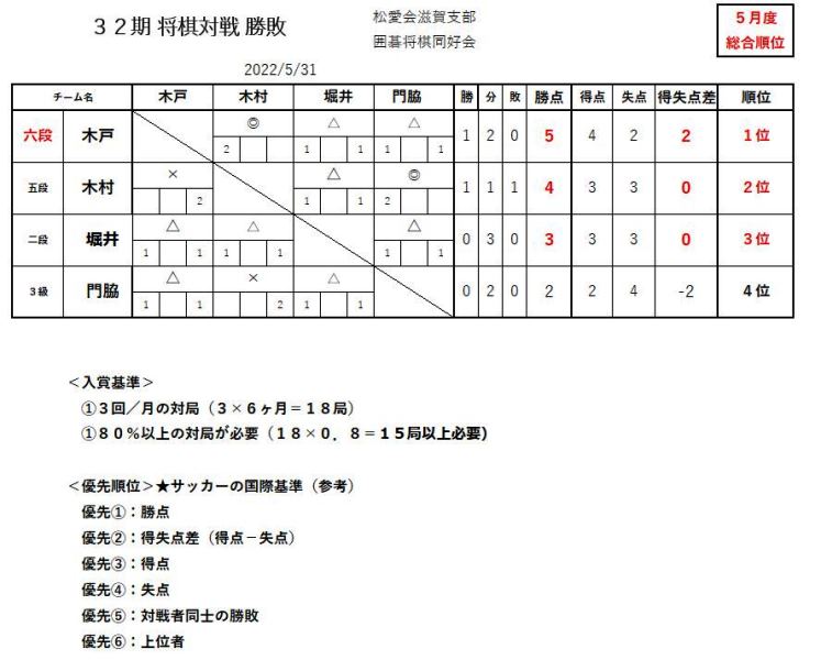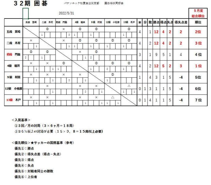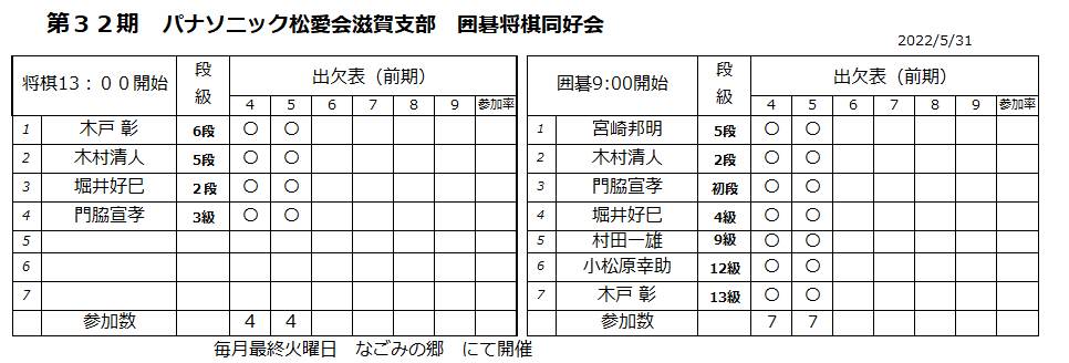 2022.06.1 囲碁将棋同好会対戦表 囲碁将棋同好会対戦202205 32期 囲碁将棋同好会 ◆囲碁・将棋同好会成績表 ◆将棋の部 第32期 対戦勝敗表 (2022年5月) ◆囲碁の部 第32期 対戦勝敗表 (2022年5月) ◆第32期出欠表 (2022年5月) 投稿者: tomita 囲碁将棋同好会対戦表 コメント: 0 囲碁将棋同好会対戦202204 32期前の記事 第32期 2022年5月 囲碁・将棋同好会を開催しまし…次の記事