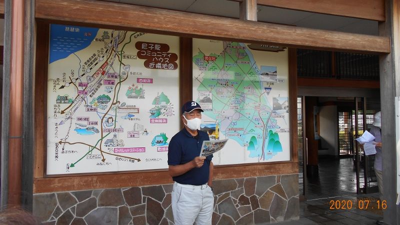・ 9:20 近江鉄道あまご駅集合 駅前の案内板前で会長挨拶、コース説明とストレッチ体操をして出発する。