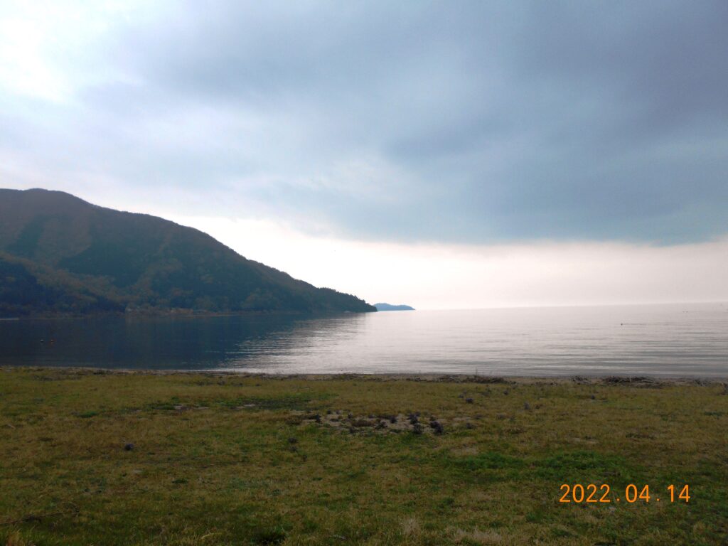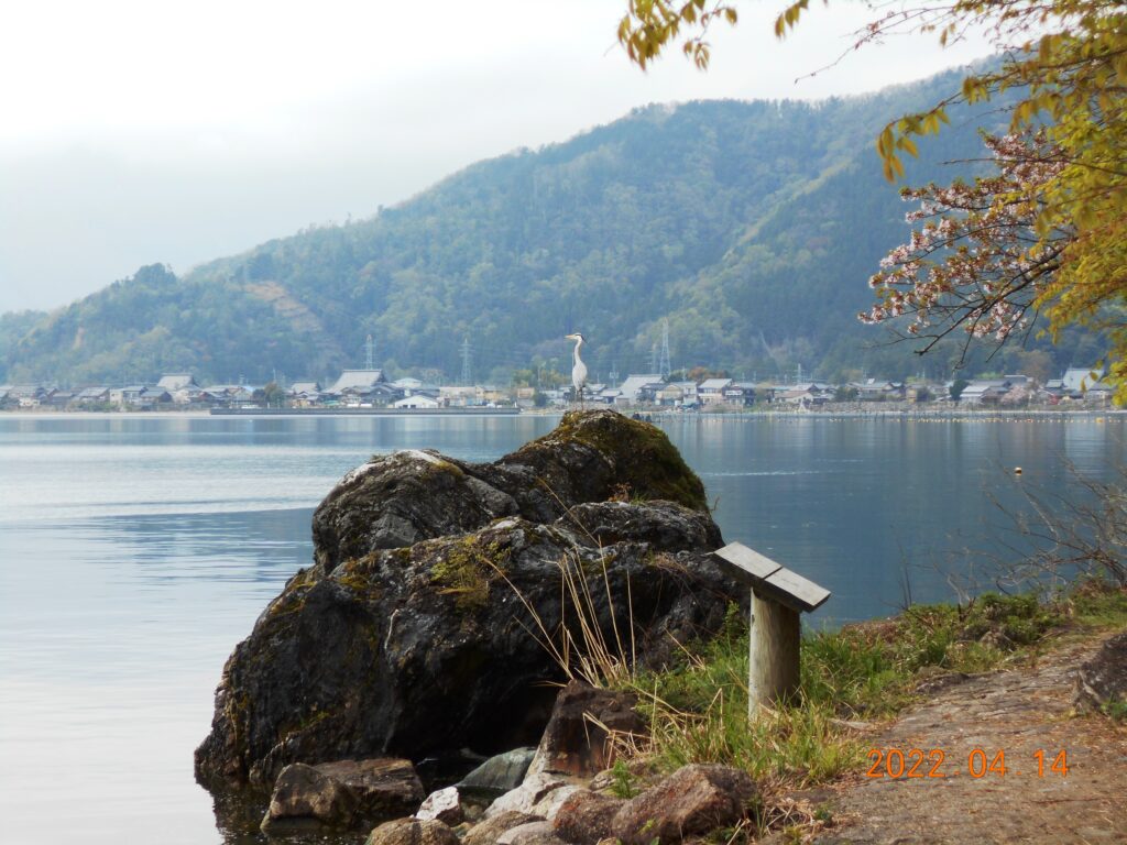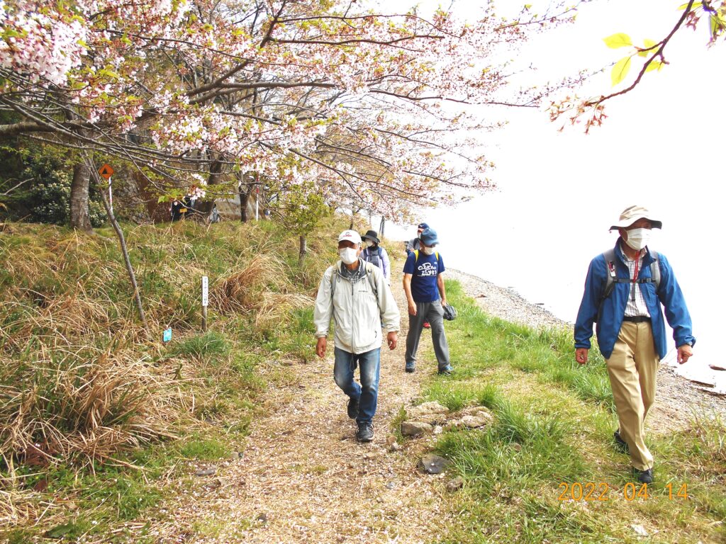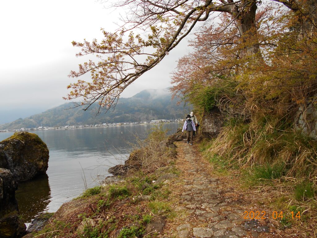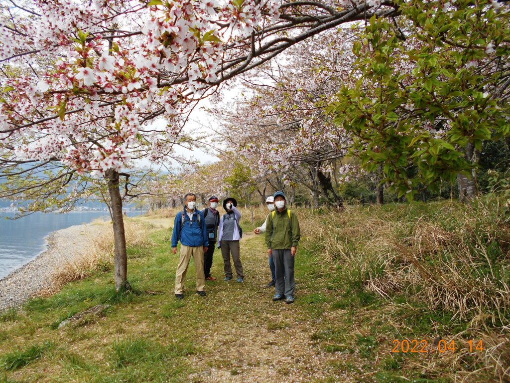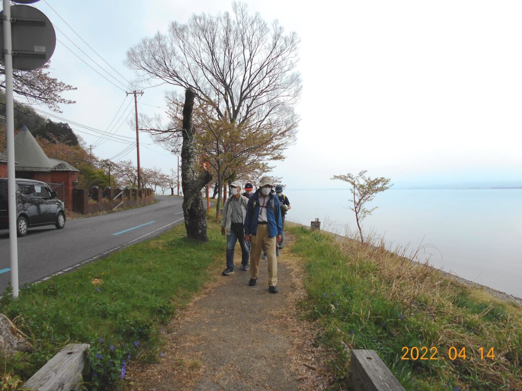 ・午後から雨本降り予想もあり、立ち寄り先に考えていた海津神社をスキップする、桜散る中湖岸沿いの道を海津大崎に向け歩を進める。