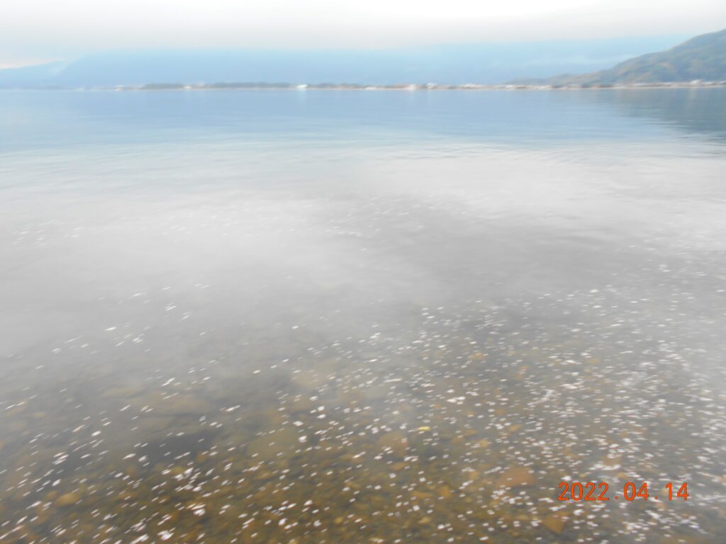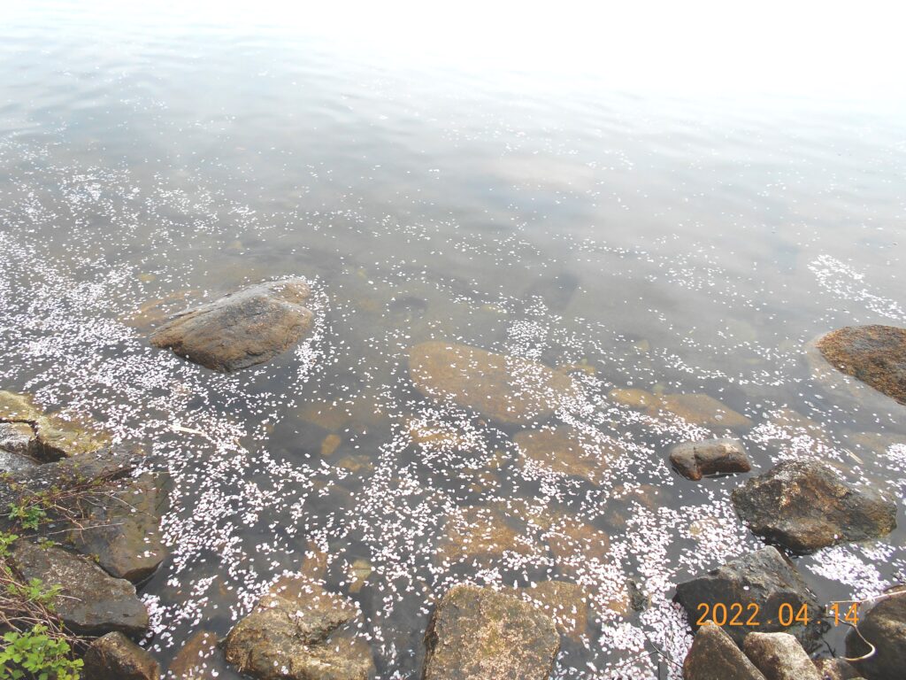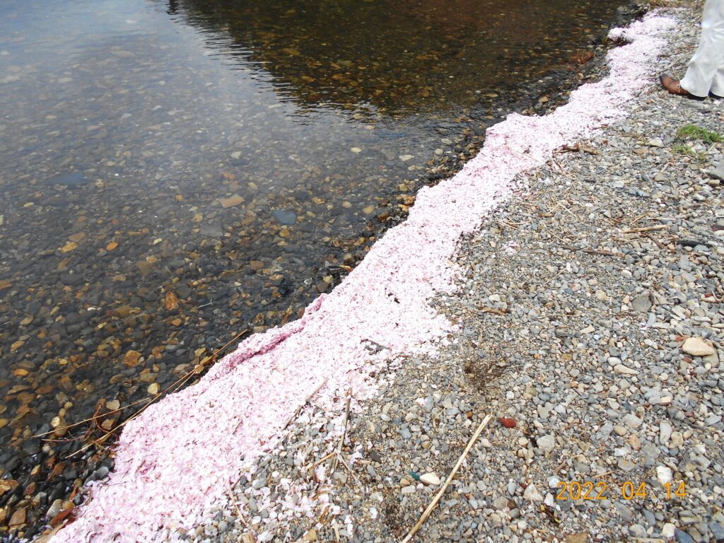 - 湖岸の波打ち際に打ち寄せられた“桜の花”