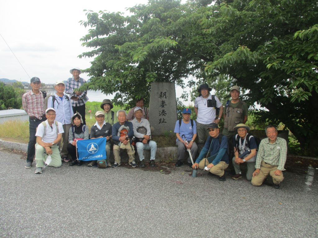 ○12:10 朝妻湊跡にて、昼食。朝妻湊は古代から東海・北陸地方の人・荷物の湖上交通の要港として発展しました。今はグランドゴルフ場、広場があります。集合写真を撮る。
