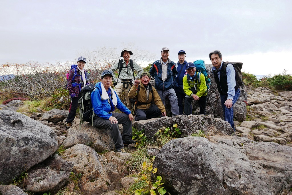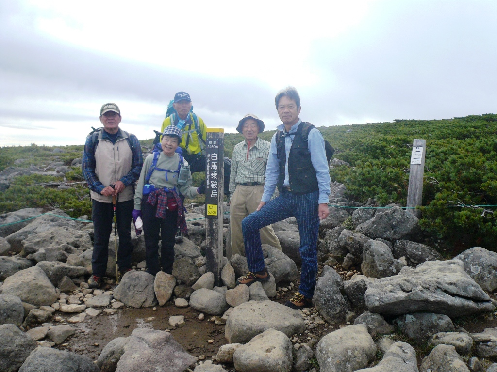 白馬乗鞍岳へ向かうメンバーを6名に絞り7:30に出発。残りのメンバーは後から来る2名を待って下山を開始する。白馬乗鞍岳へは岩場の急登で、途中夏には雪渓が残る大きな岩に埋め尽くされた難所を通過し岩場の急坂を登りきると山頂、8:50頃白馬乗鞍岳山頂(2437m)に登頂。1名途中敗退で登頂は5名となる。風が冷たく記念写真を撮り早々に下山を開始し、11:10栂池自然園に11名全員無事下山を果たす。
