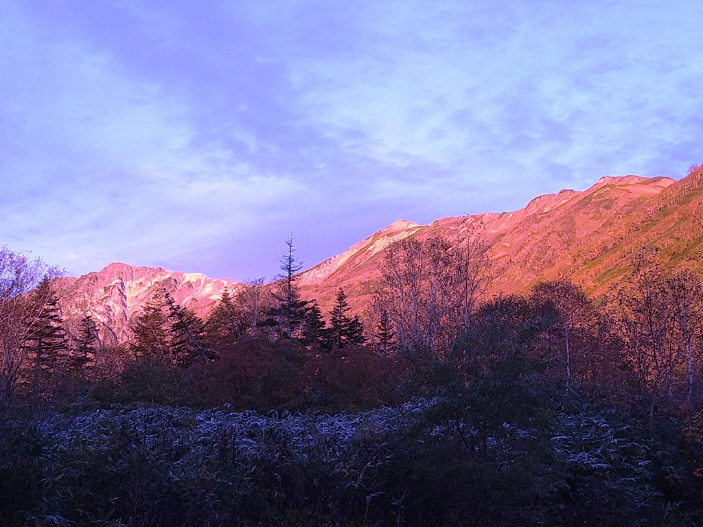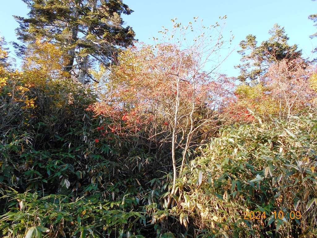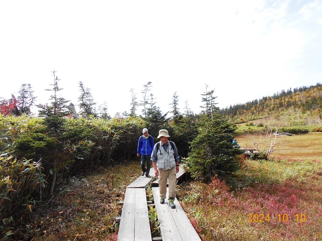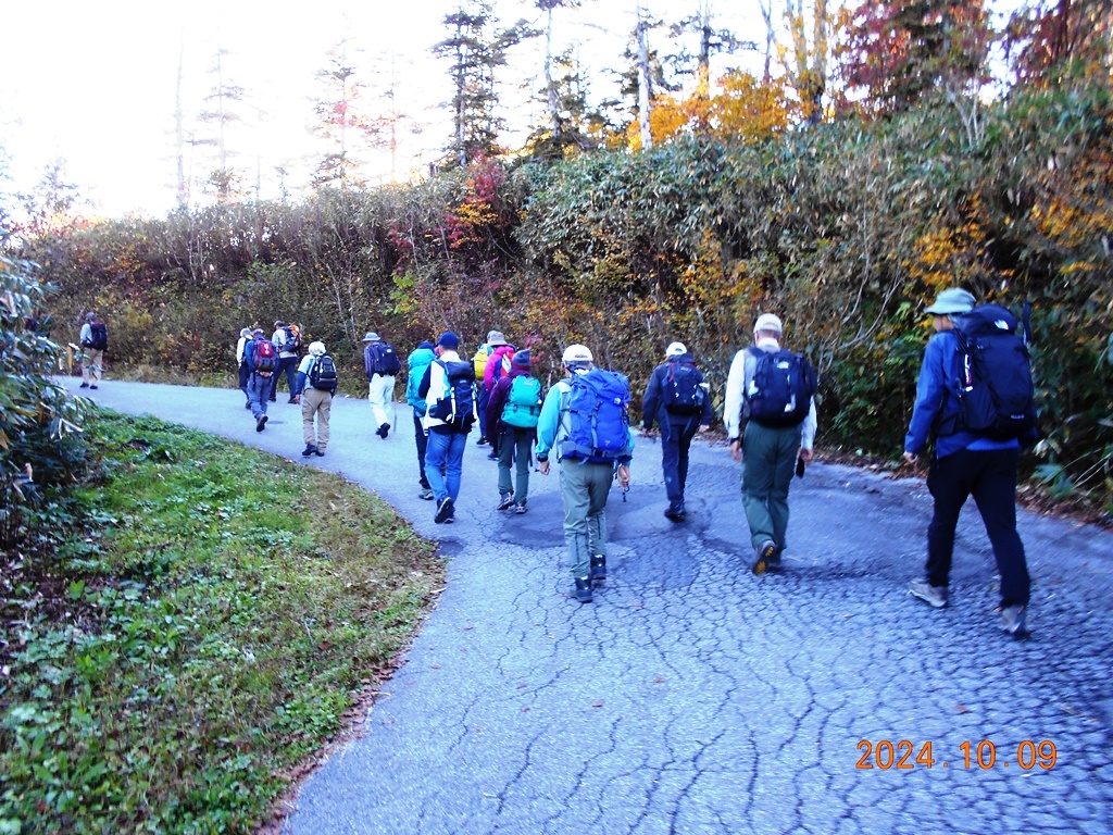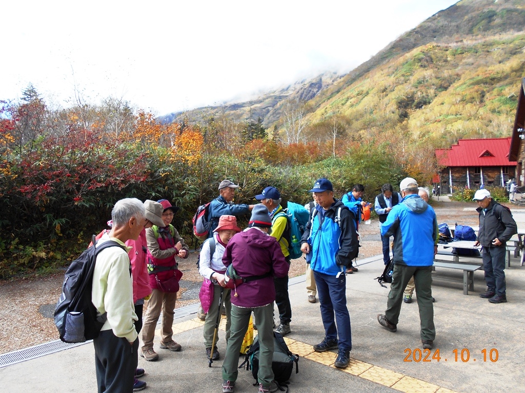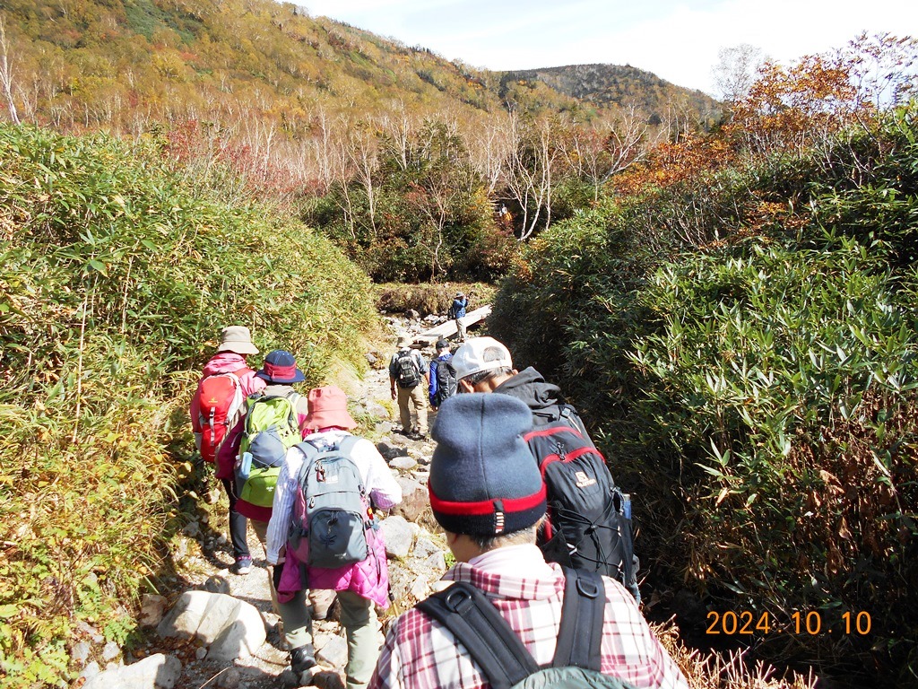 ・6時までに山荘の弁当を頂き、6時玄関前に集合。注意事項説明・準備体操を終え6:10登山口に入る。天狗原(2200m)までは緩やかな登りが続き、最初は11名揃って上るが途中から列が長くなる。 天狗原には予定より少し遅れ7:20頃に先頭が到着、先着5名で記念写真を撮る。天狗原の湿原では昨夜の冷え込みで氷が張っていた。黄色になった草紅葉を観賞できたが今年の紅葉は夏の暑さの影響か鮮やかさに欠けるように見える。