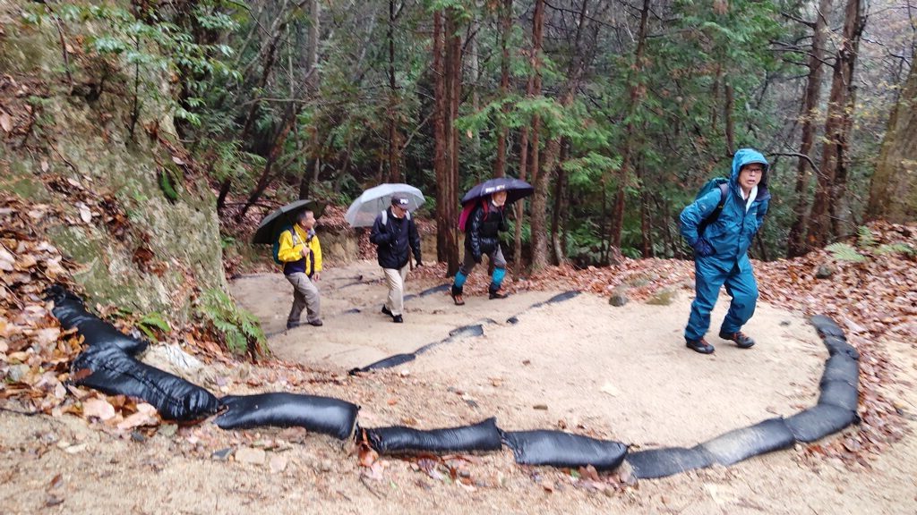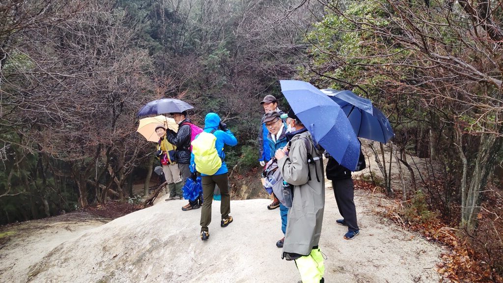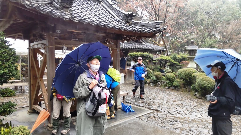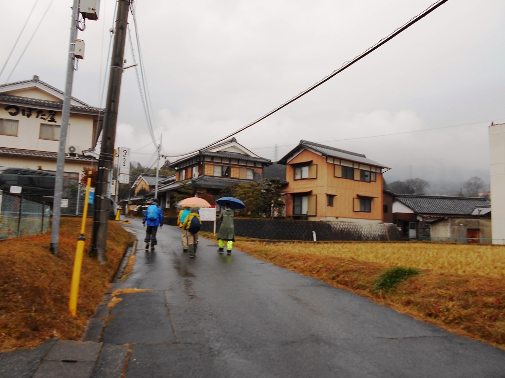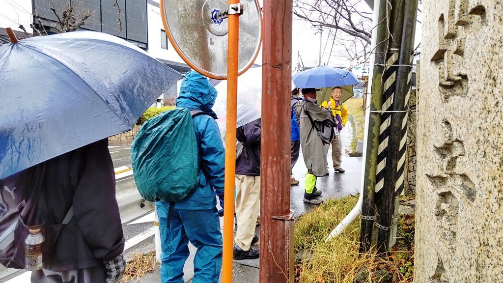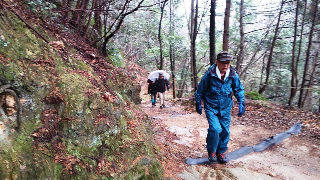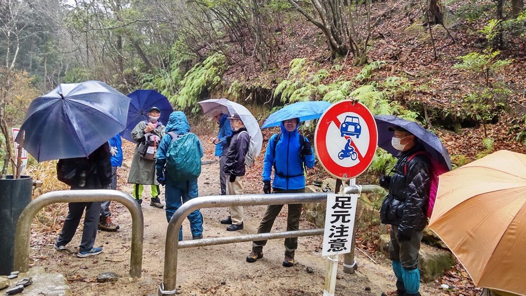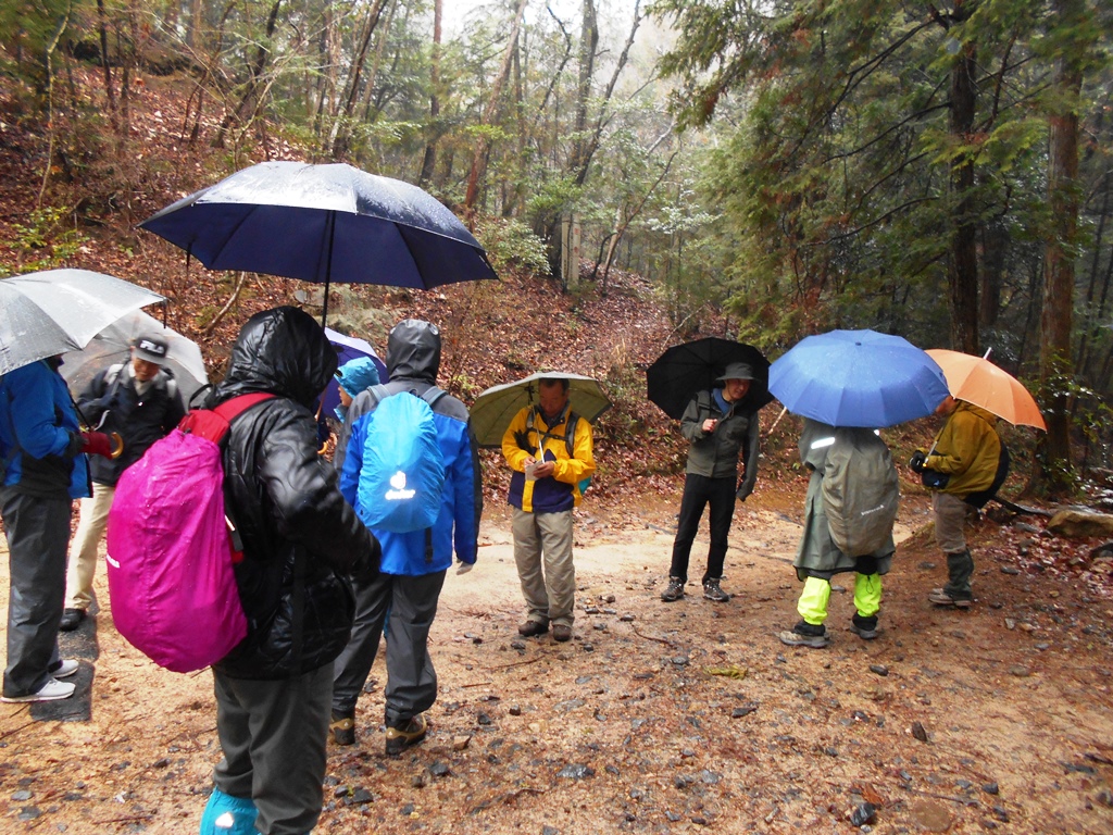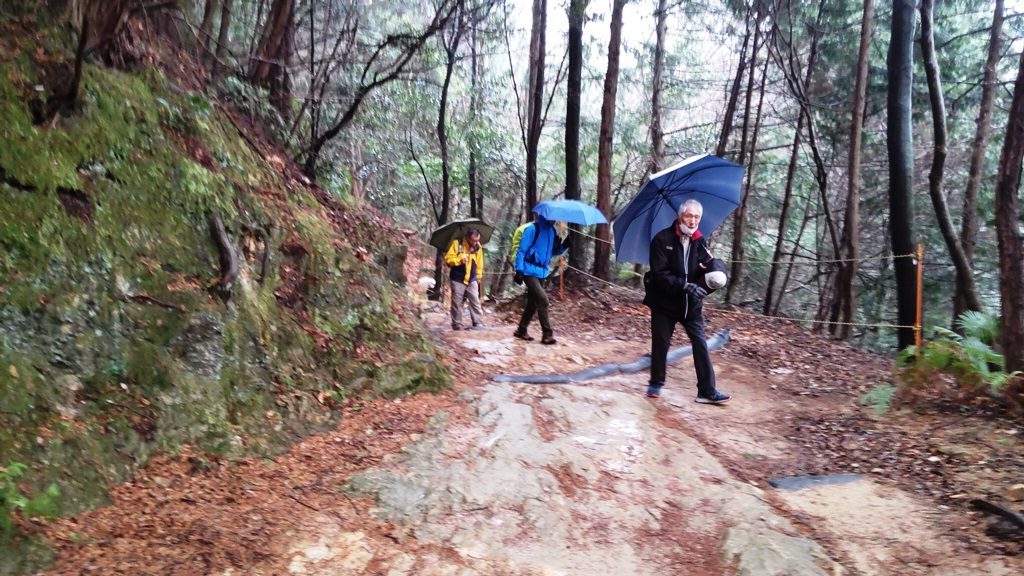 ○12時55分 集合写真をとり出発する。直下の石段・石畳道は雨で濡れて滑りやすいので注意しながら来た道を戻る。