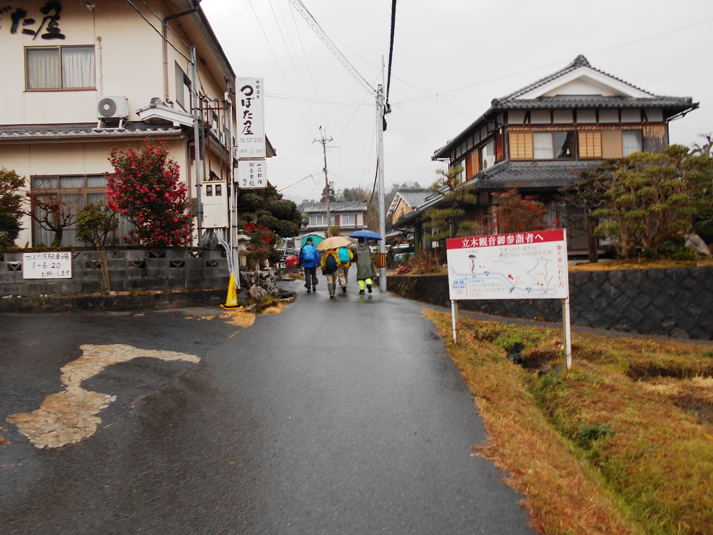○11時10分 二葉屋旅館前から立木観音参道に入る。立木観音まで20丁と表示の丁石がある、12丁から8丁間の急な坂道を喘ぎながら登り、さらに歩みを進める。