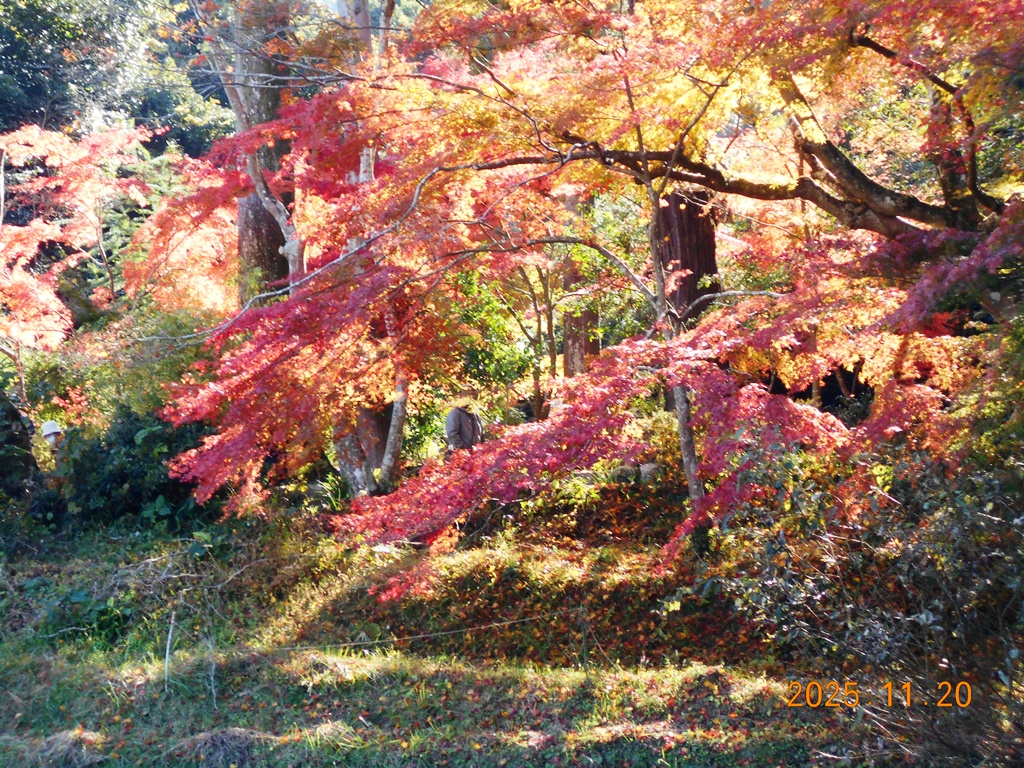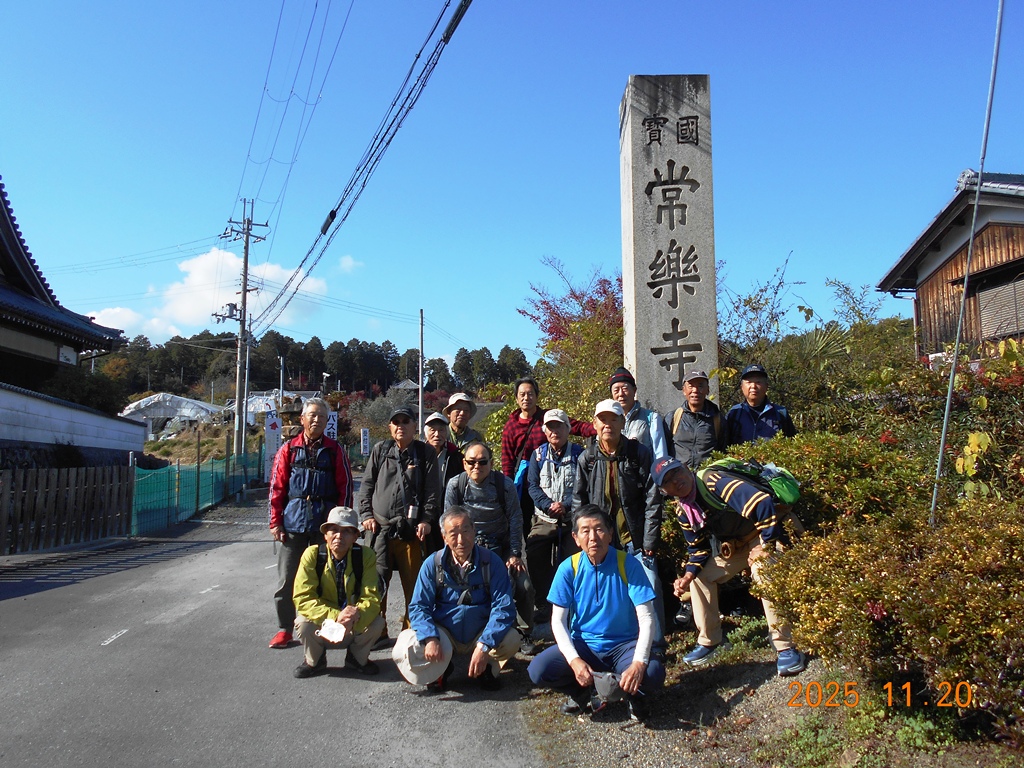 長寿寺の山門前で記念写真を撮り、赤や黄色に色づき始めた参道を本堂に向かう