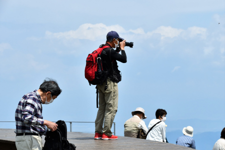 | 10:25頃 | ロープウエイで山頂駅着、降車後徒歩でびわこテラスに移動 (ロープウエイは団体割引活用し、往復 1人 3500円が2500円に) びわこテラス付近で、各人思い思いに撮影と昼食を堪能 |