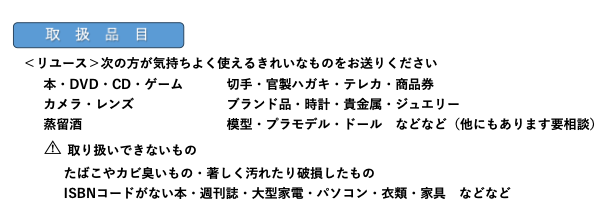 ●使い終えた本・CD・DVDや書き損じた官製はがきなどをリサイクルして、その寄付をソーラーランタン(パナソニック製)に換えて、電気のない暮らしをしている方々にお届けする活動です。