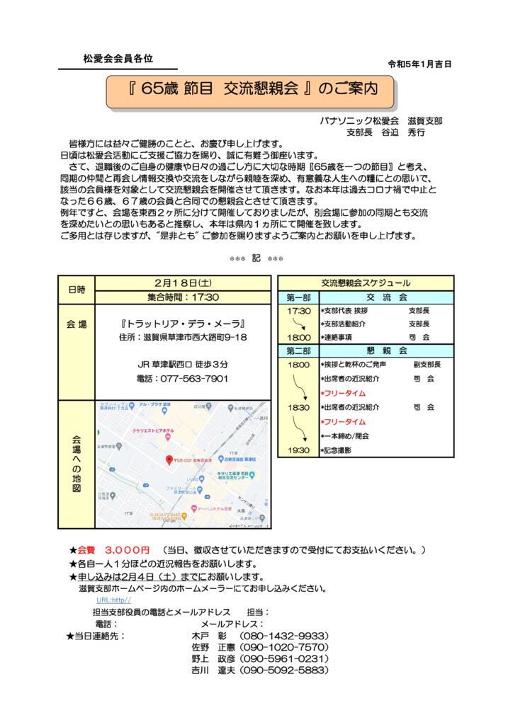2022.12.12 一般公開前, 公開前 65歳節目 交流懇親会の案内 『65歳 節目 交流会』参加申し込みは此方から 個人認証未登録の方は各位地域の支部役員まで連絡をお願いします。 投稿者: tomita 一般公開前, 公開前 コメント: 0 グラウンドゴルフ同好会2022年12月 第198回月例…前の記事 2025年度 湖の辺歩こう会実施予定表次の記事