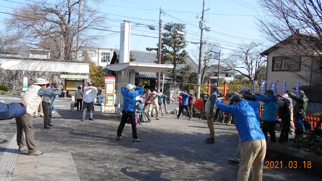 ・ 9:30 京阪坂本比叡山口駅集合 駅横で会長挨拶、コース説明と南岡指導でストレッチ体操をして出発する。
