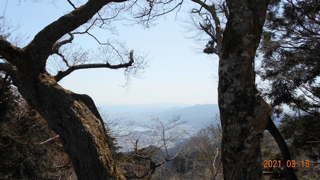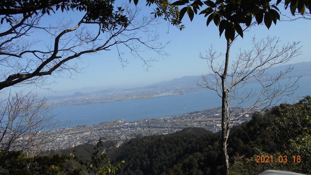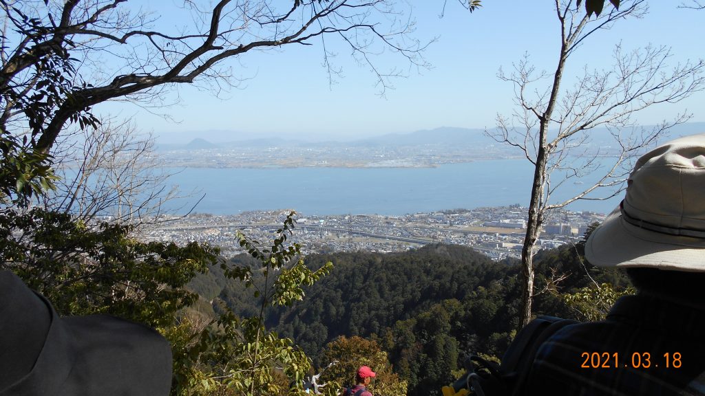 ・13:50 無動寺谷から下山開始。やがて展望の良い遠見岩に到着、琵琶湖や大津市街・近江富士を眺める。