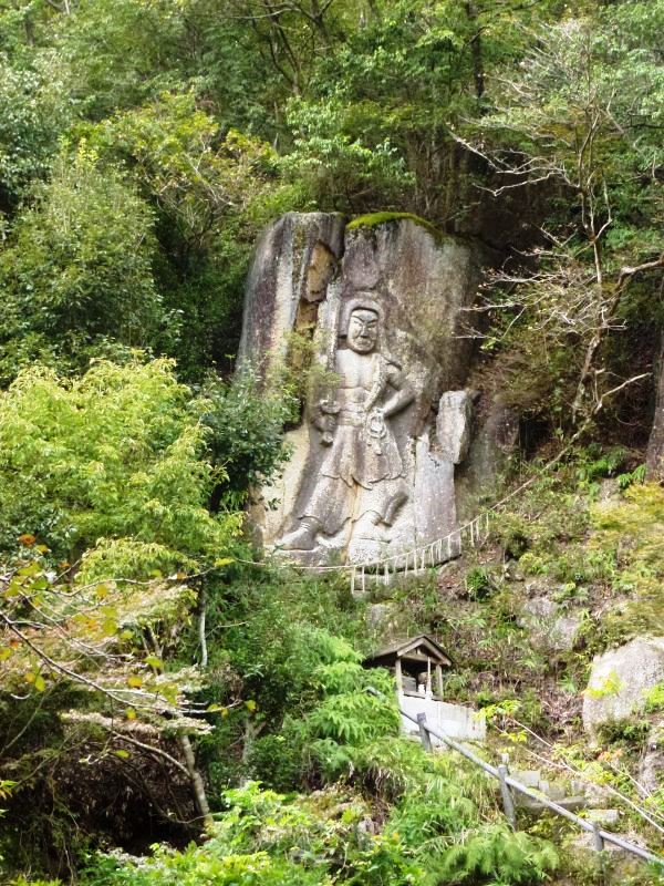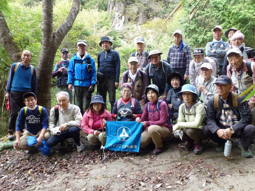 ・登山口より磨崖仏不動明王を目指し坂道を登る。不動明王前で休憩、記念写真を撮って十二坊温泉を目指して再び坂道を登る。