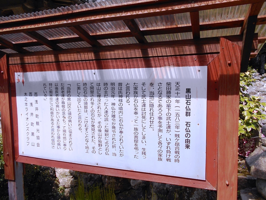 賎ケ岳の合戦(天正十一年 1583年)で敗れた柴田勝家配下の家族が、身内の戦死者を弔うため石仏を奉ったという。