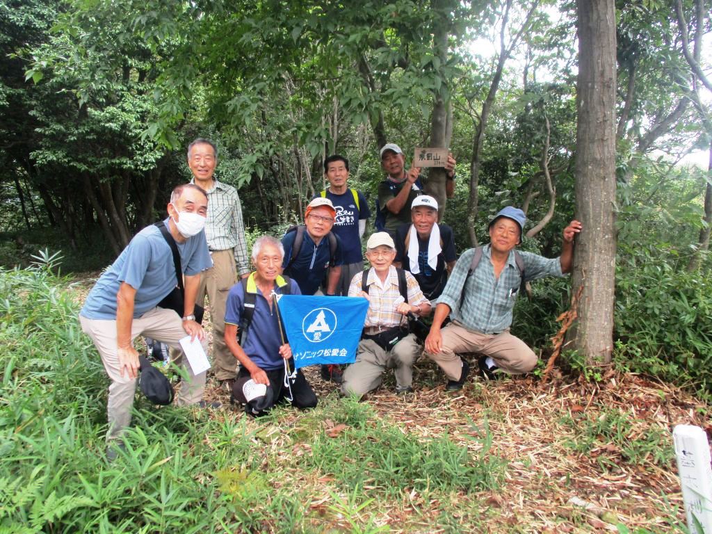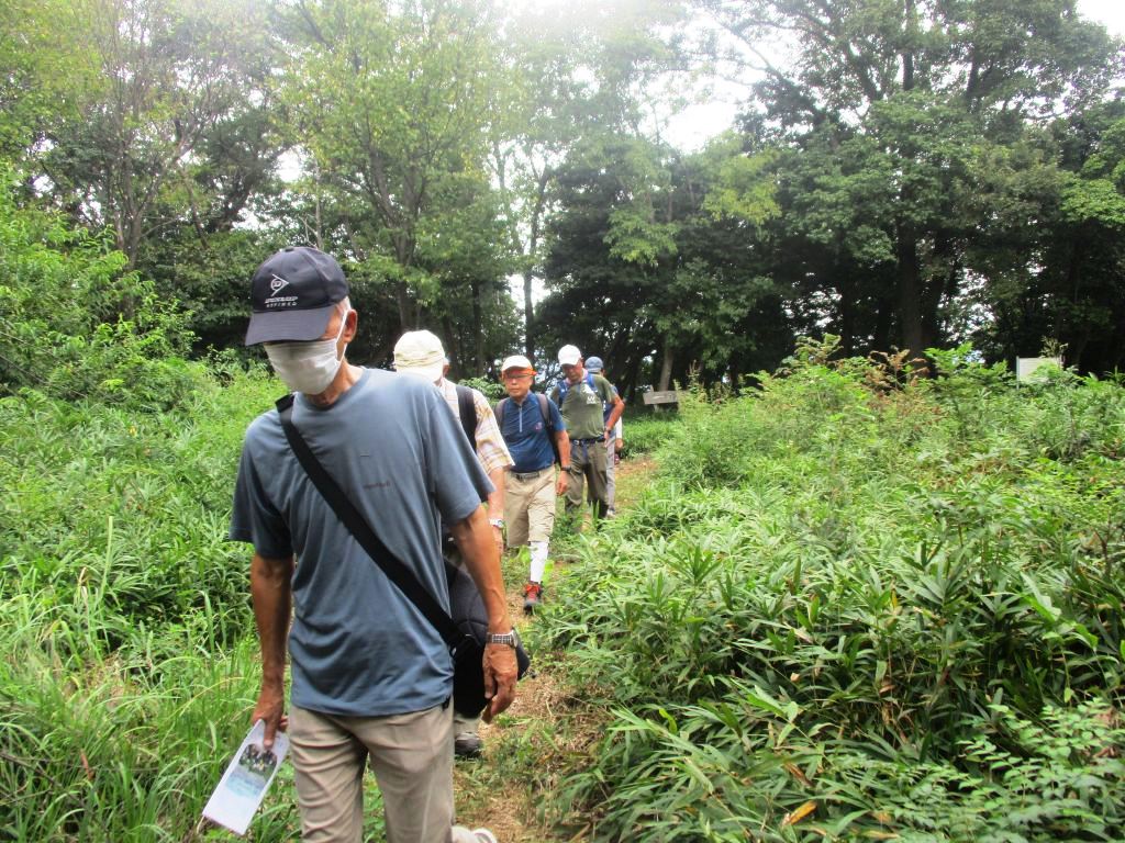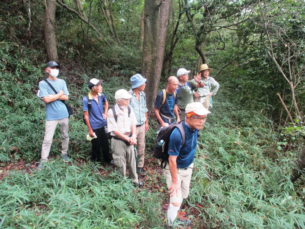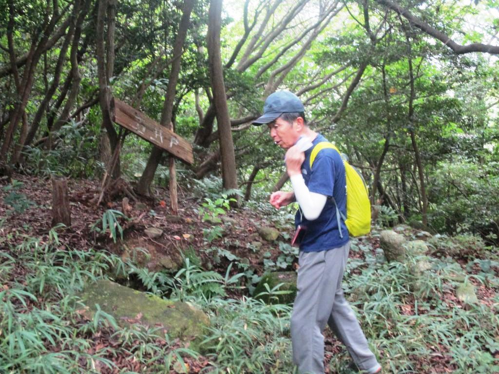 ○12:00 集合写真を撮影し下山にかかる。道は広々と刈り払らわれているが、切り株や根が出ており足元に注意しながら進む。暫くすると舗装された上水道管理道路に到達し快調に歩く。