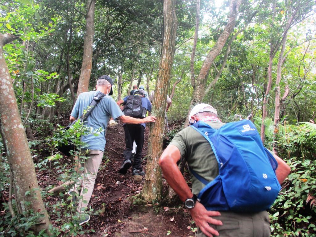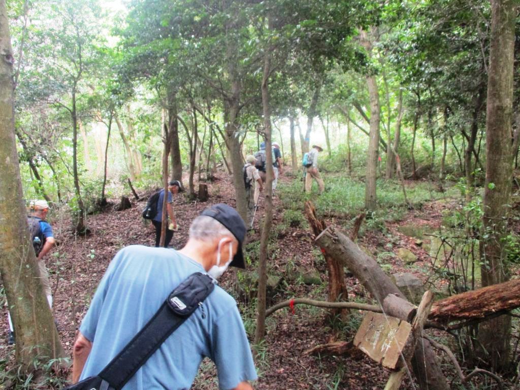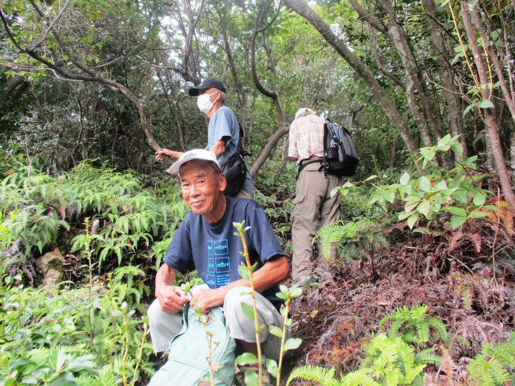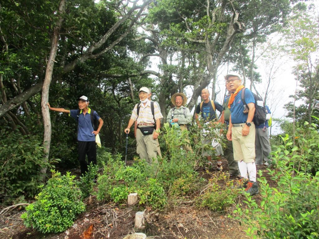 ○12:00 集合写真を撮影し下山にかかる。道は広々と刈り払らわれているが、切り株や根が出ており足元に注意しながら進む。暫くすると舗装された上水道管理道路に到達し快調に歩く。