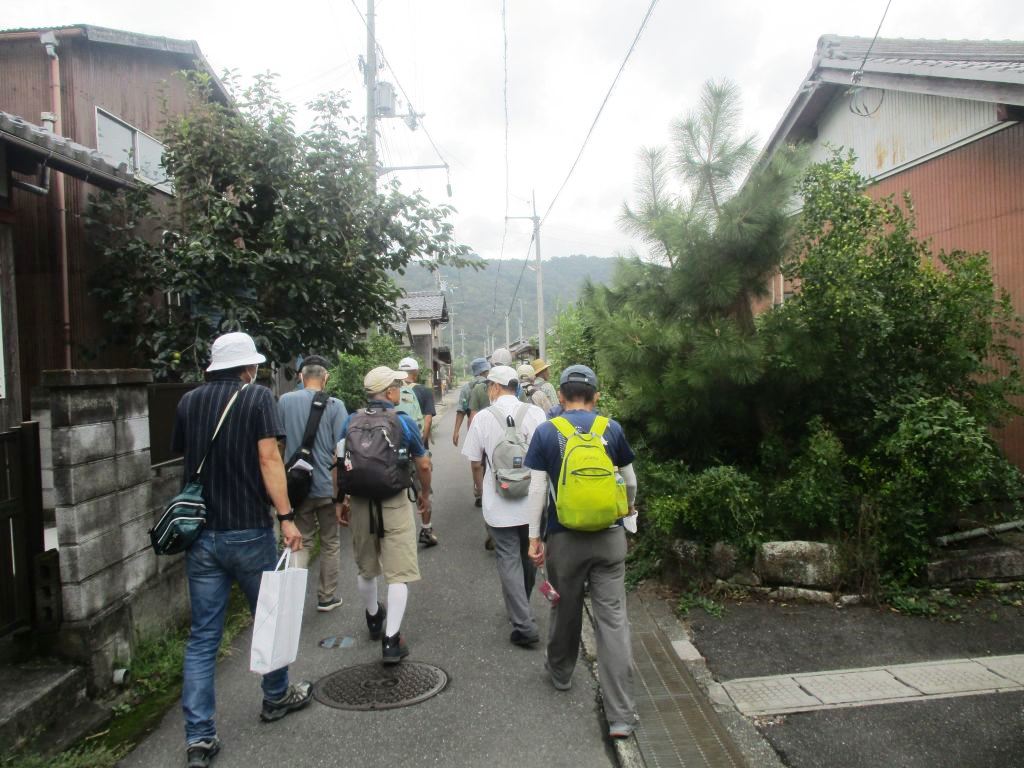 ○10:00 近江鉄道平田駅に集合し代表挨拶の後、リーダーから一部行程の変更説明があり、準備運動後出発する。稲刈りの済んだ水田を見ながら登り口を目指して歩く。