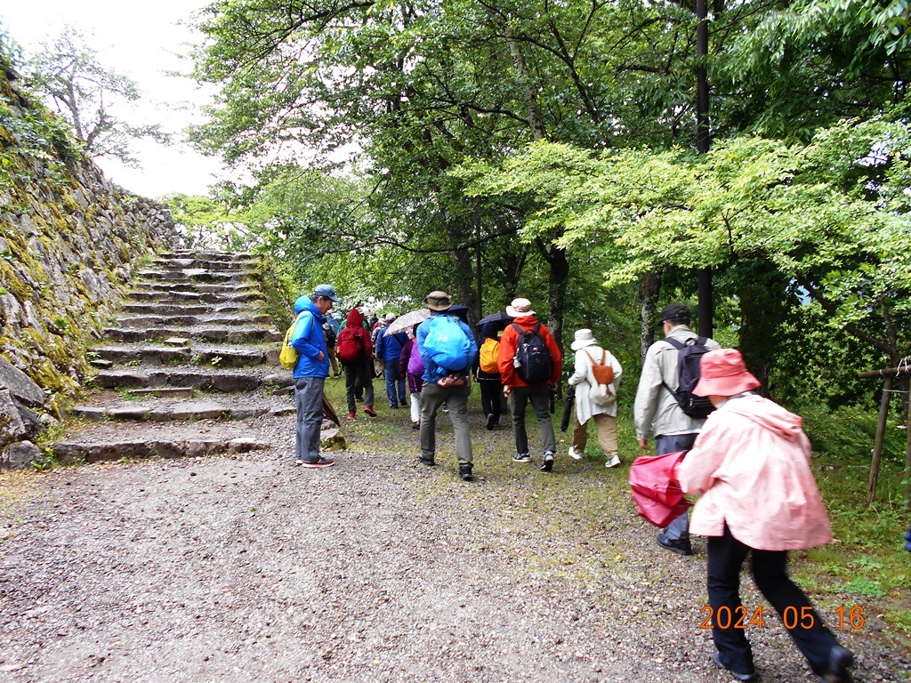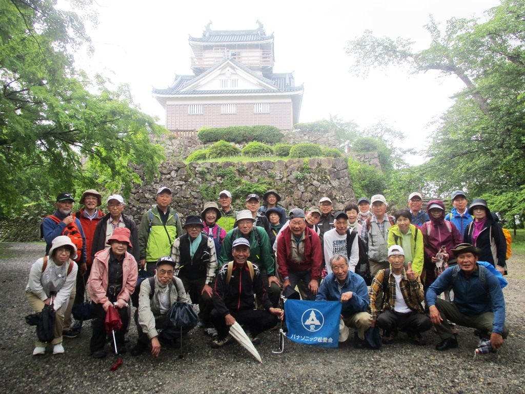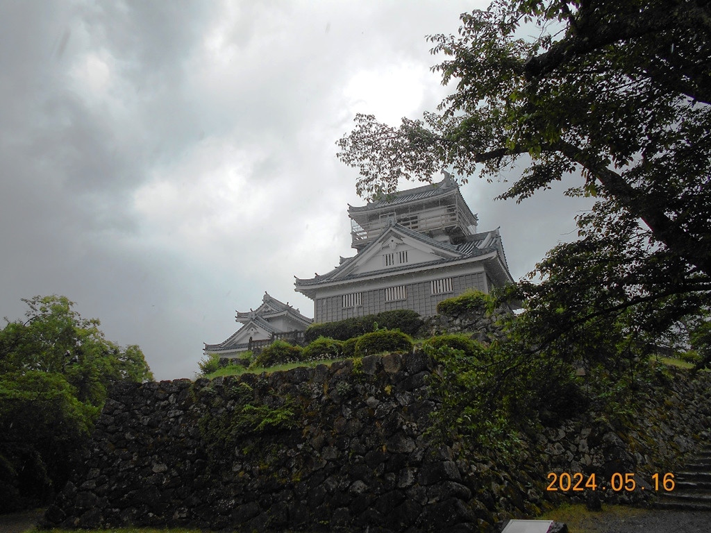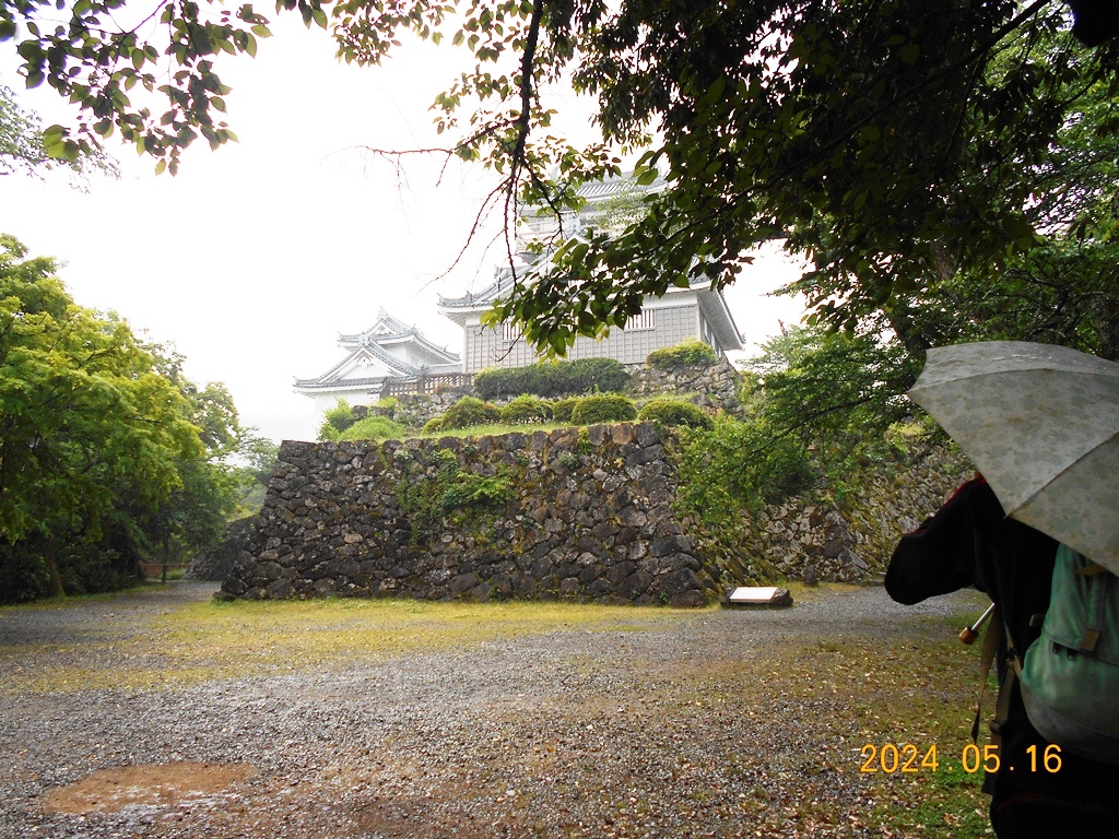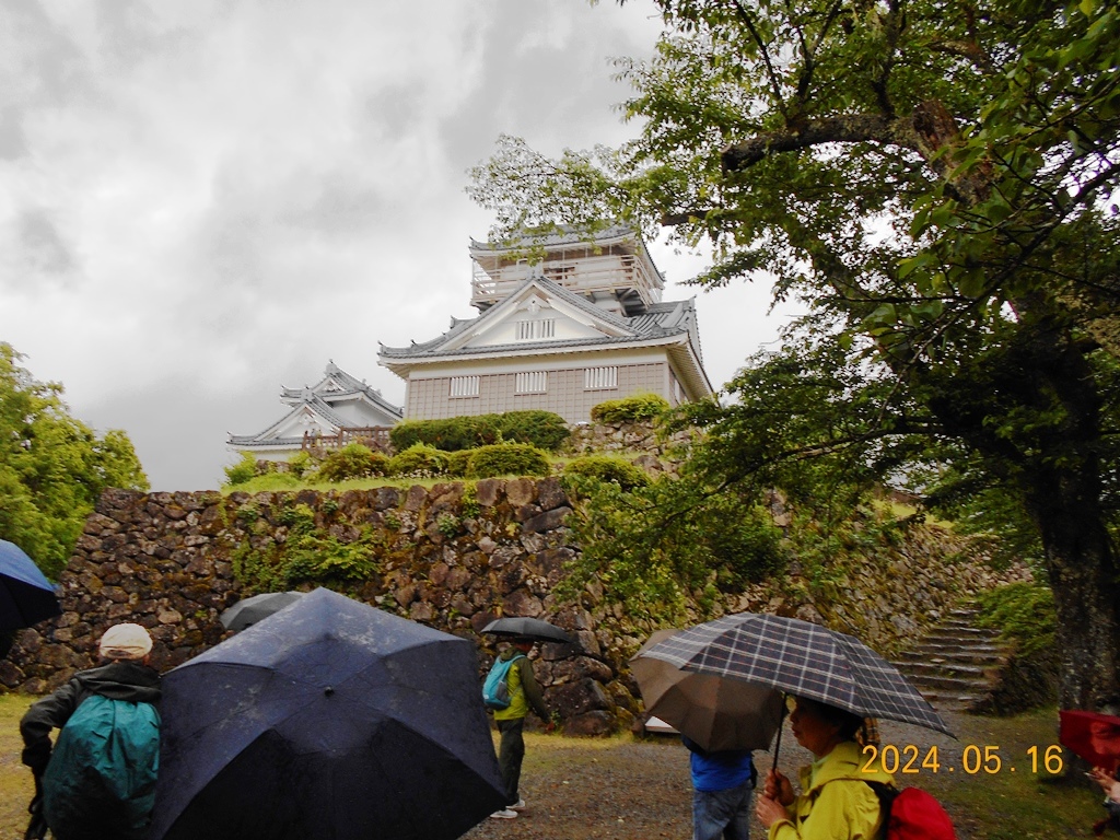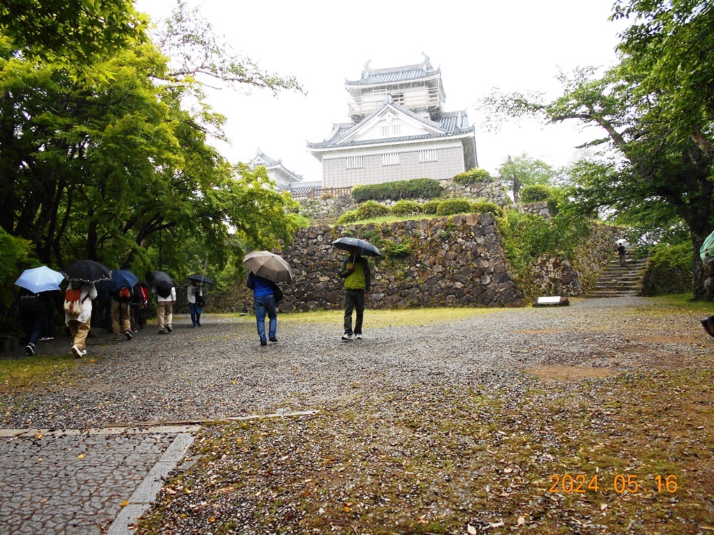 ○小雨の降る中、城山に登る。天守閣を仰ぎ記念写真。下山して休息所で昼食。