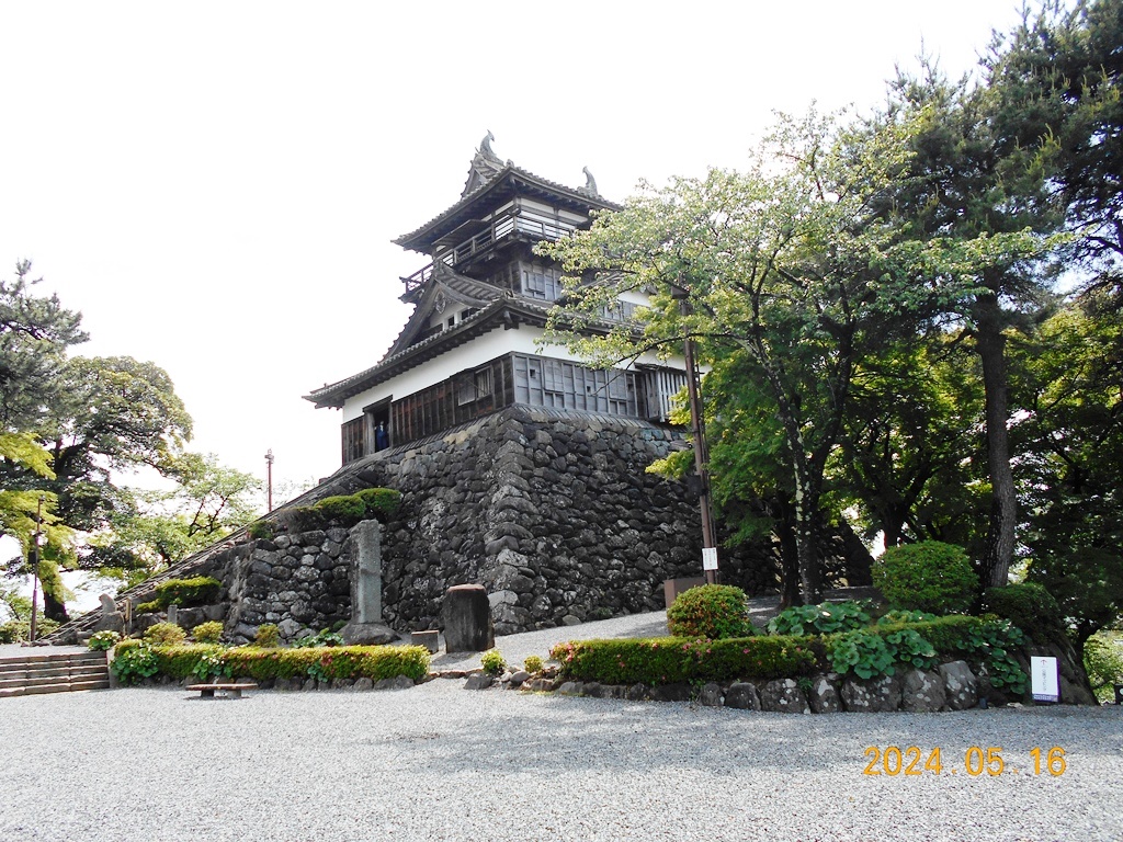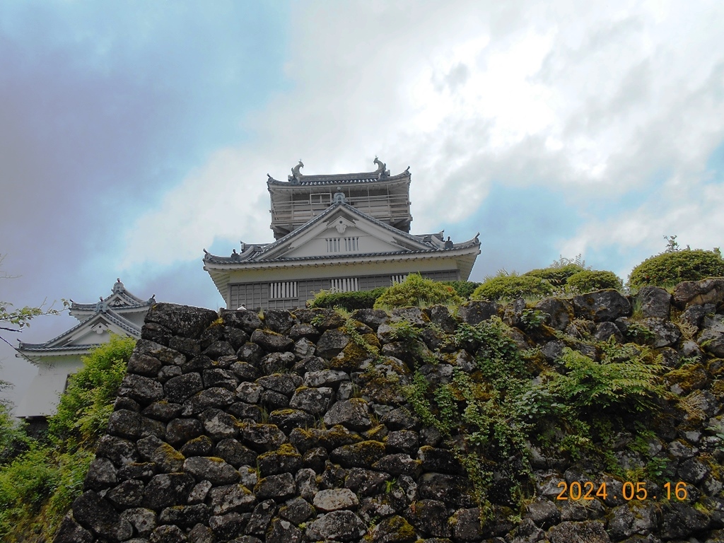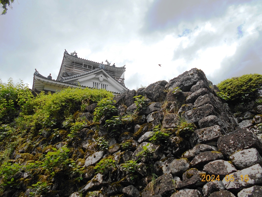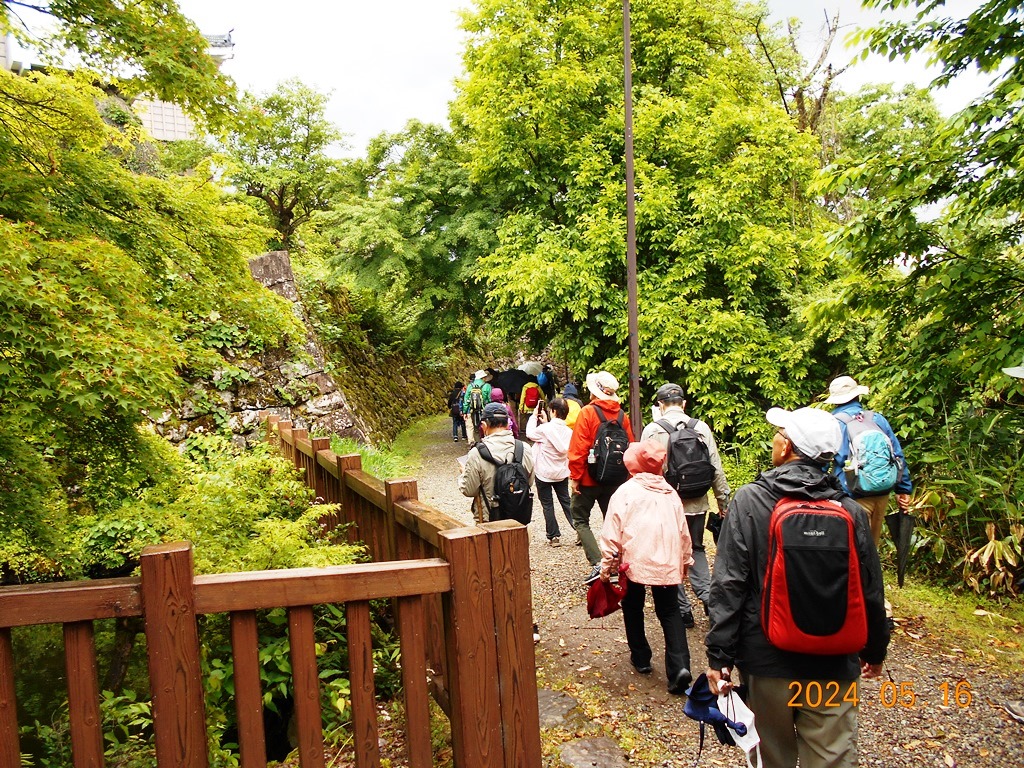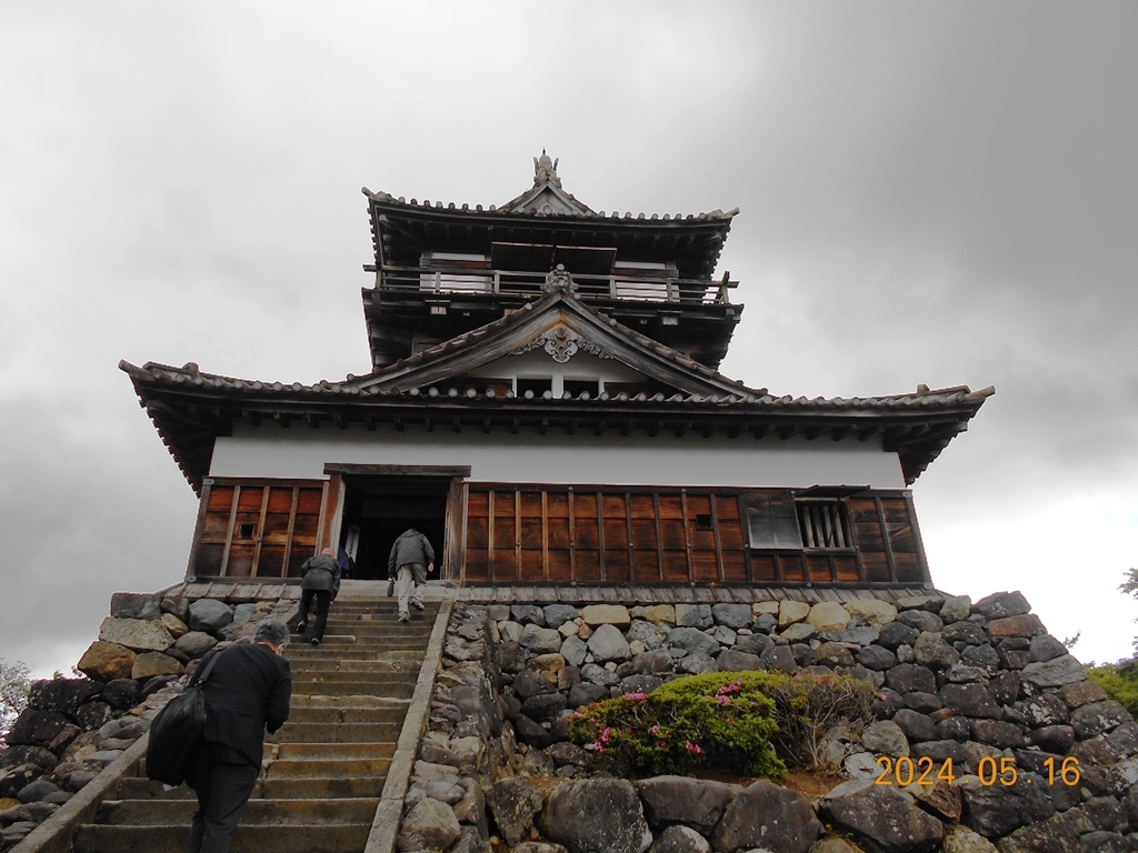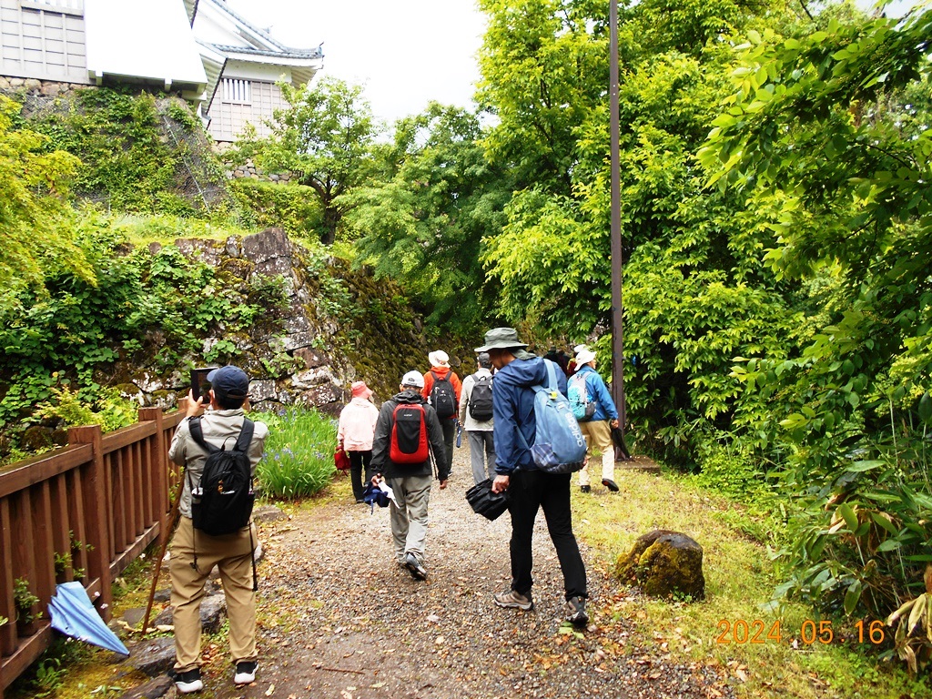 ○小雨の降る中、城山に登る。天守閣を仰ぎ記念写真。下山して休息所で昼食。