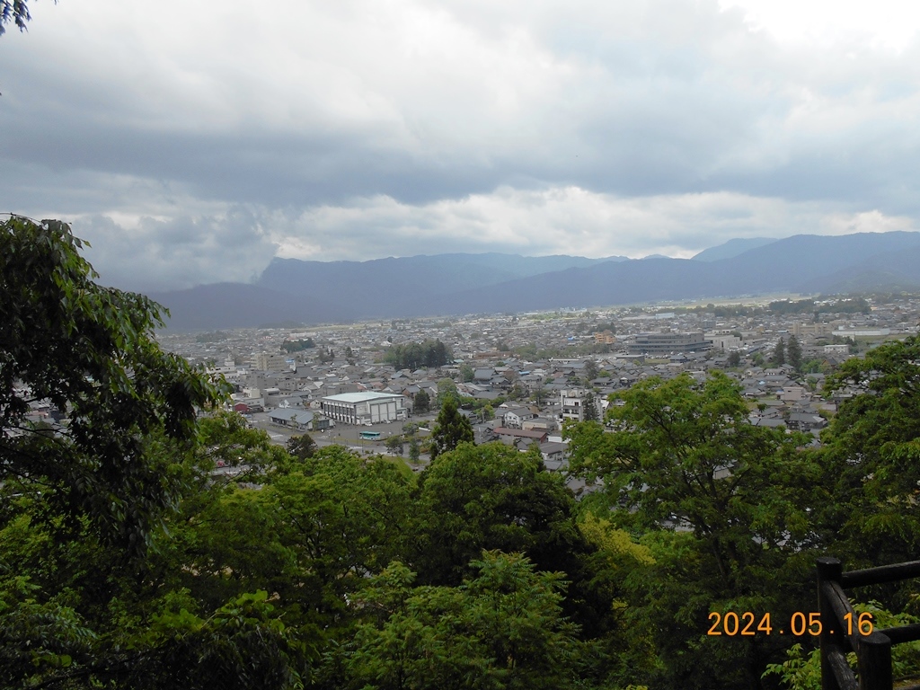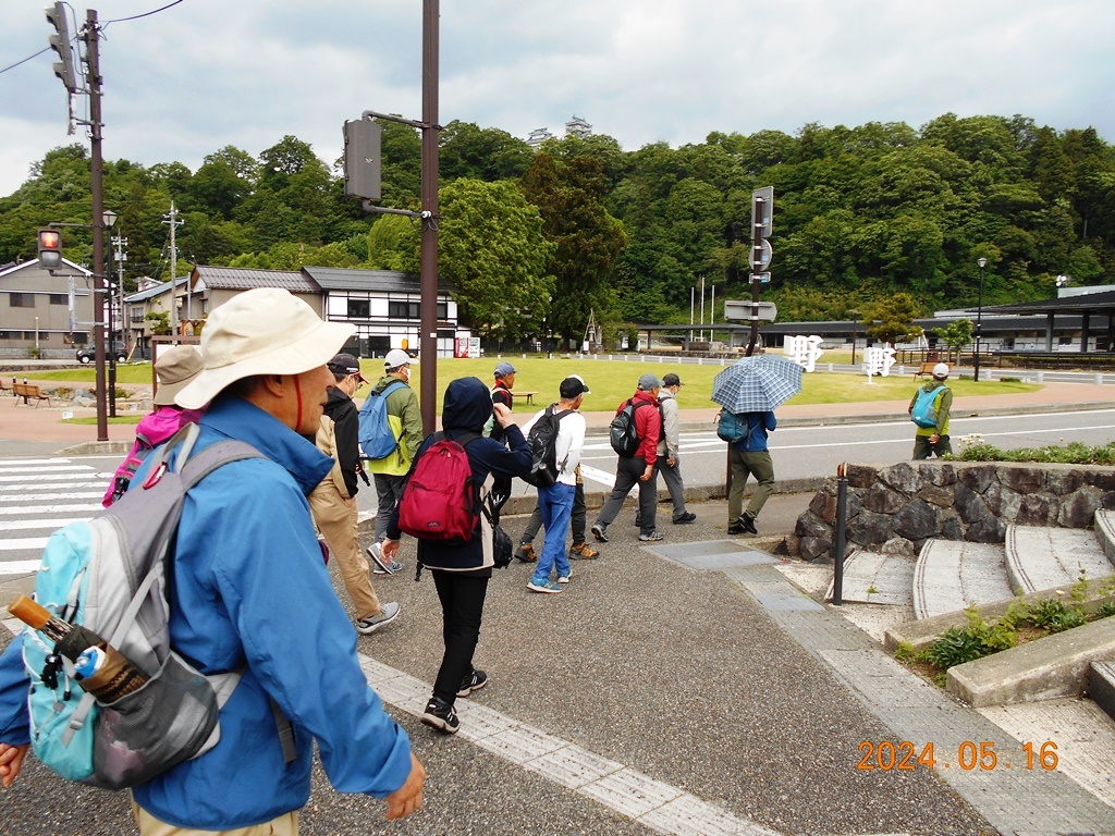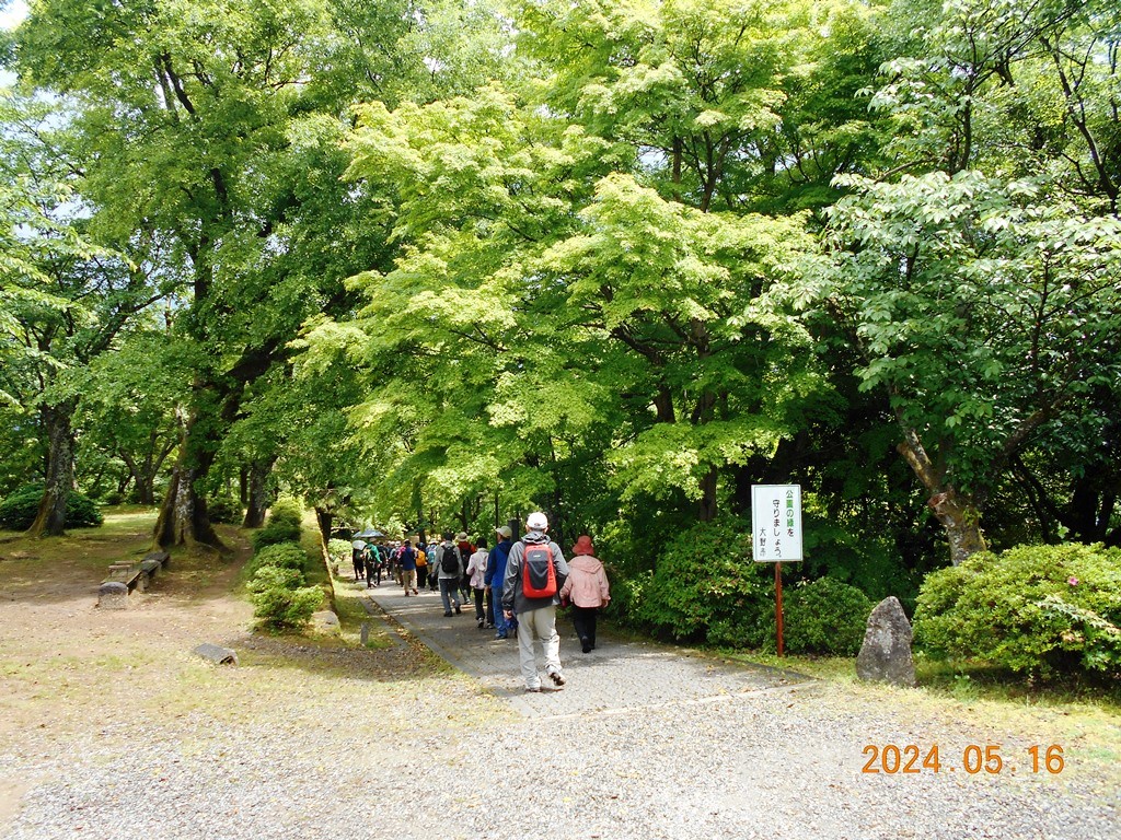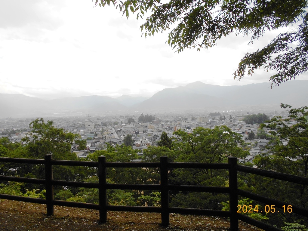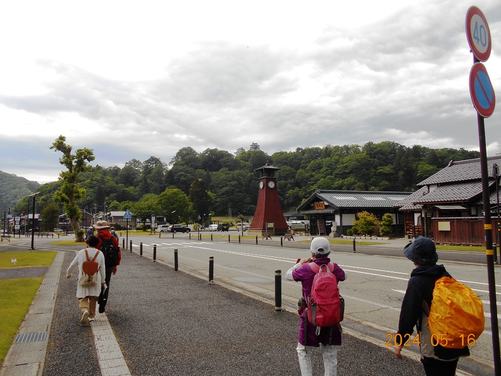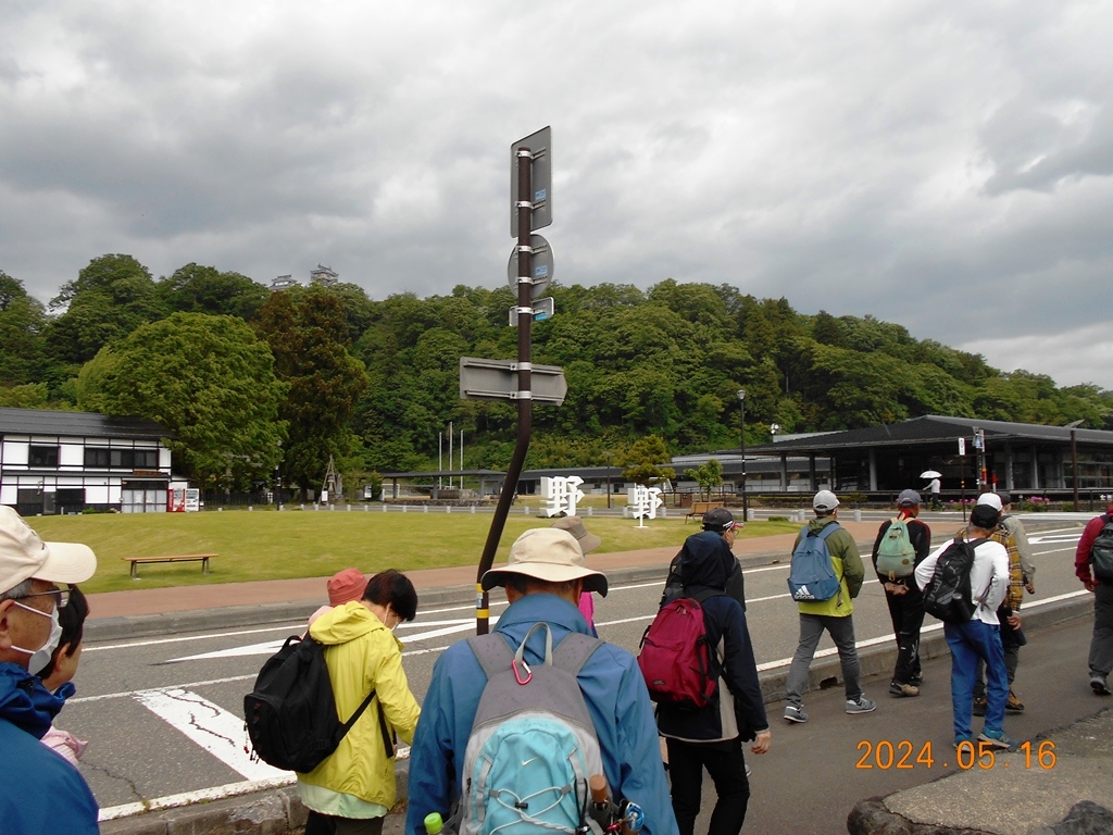 ○小雨の降る中、城山に登る。天守閣を仰ぎ記念写真。下山して休息所で昼食。