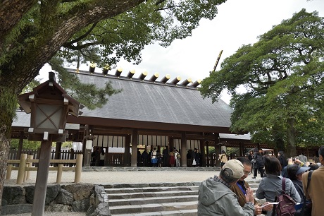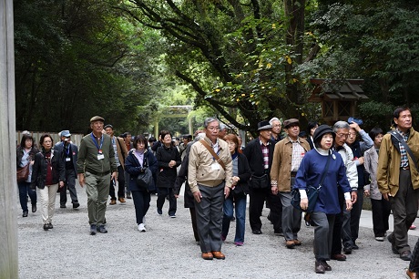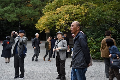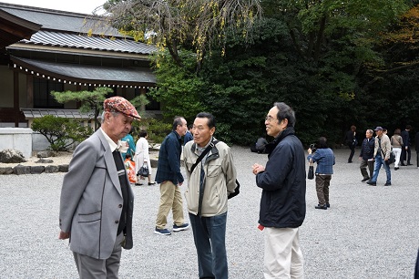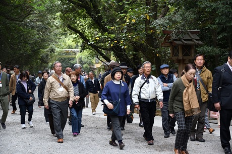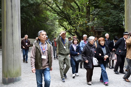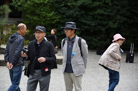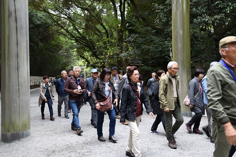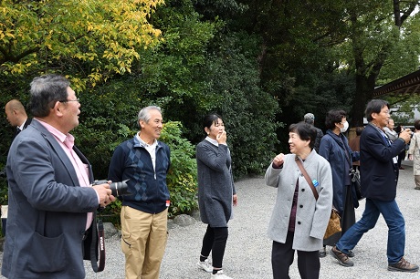・熱田神宮には予定より15分遅れで到着、本宮前で集合写真を撮り、参拝を済ませてバスに戻る。