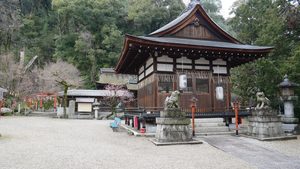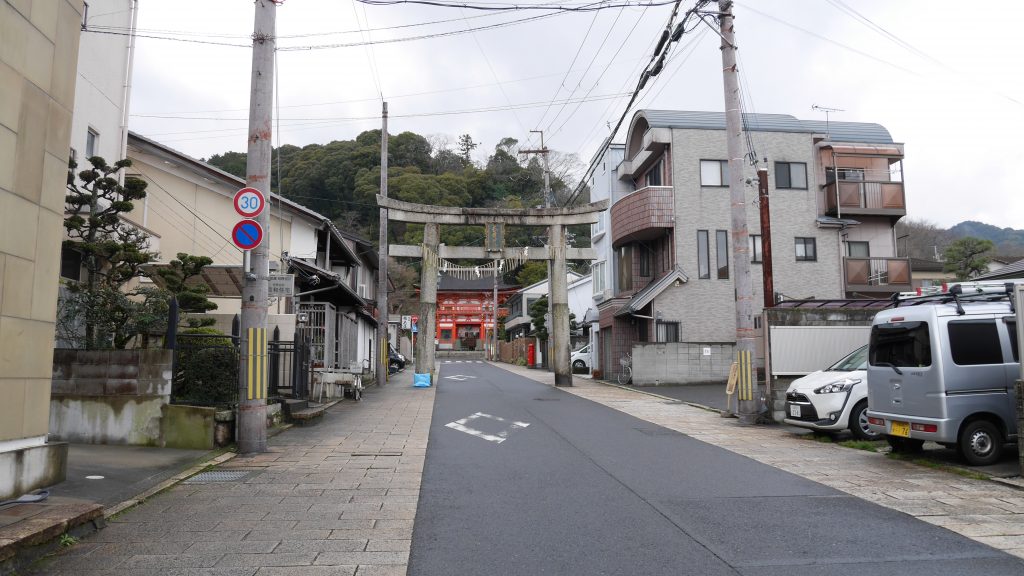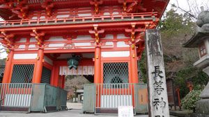 長等商店街を抜けて少し山手に歩くと程なくして「長等神社」に到着します。この神社は、天智天皇が天智6年(667年)に近江大津宮に遷都した際、長等山の岩座谷に建速須佐之男大神を祀ったのが始まりです。