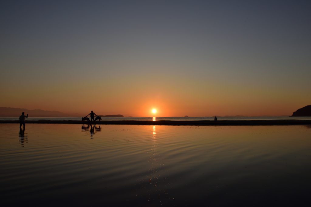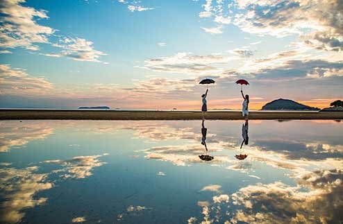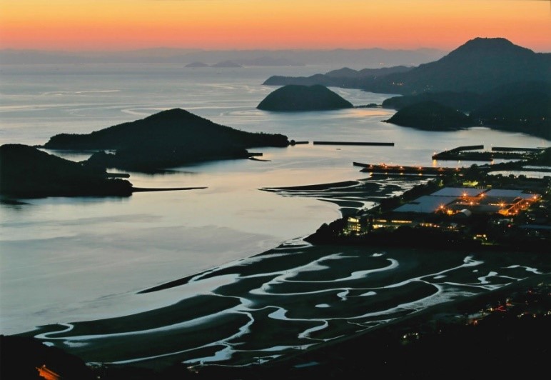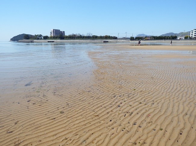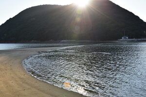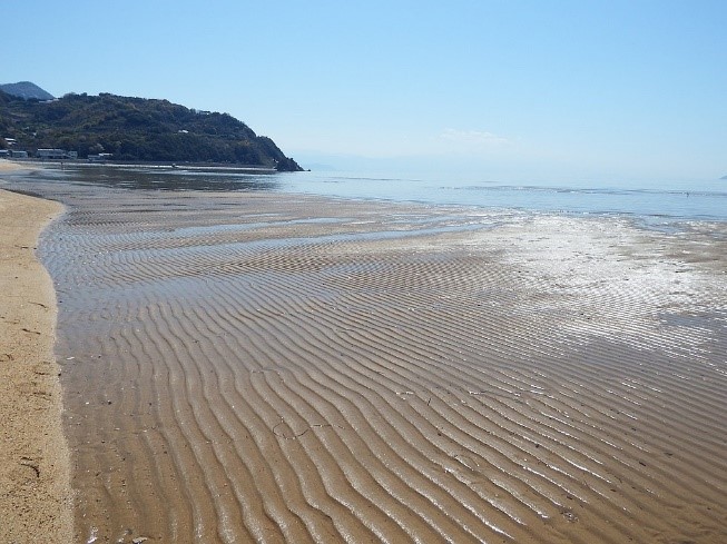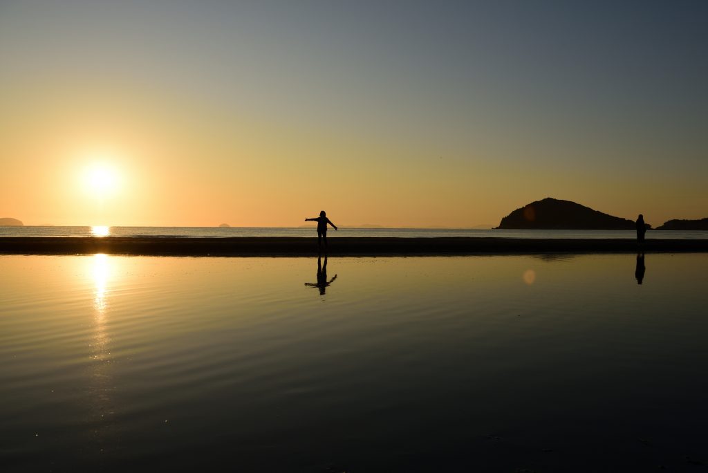 父母ヶ浜は、三豊市仁尾町にある燧灘(ひうちなだ)に面した海岸です。全長1kmの砂浜は、海水浴場として夏季には多くの来訪者があります。凪(なぎ)で無風で大潮の際には、水面が鏡面状に見えるウユニ塩湖に類似した写真を撮影することができ、「日本の夕陽百選」にも選ばれています。
