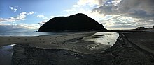 - 丸山島のエンゼルロード2 島の堤防の上に浦島像が小さく見えます
