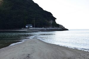 - 詫間町の丸山島。干潮時には地続きになる。 浦島神社、竜王宮という祠がある